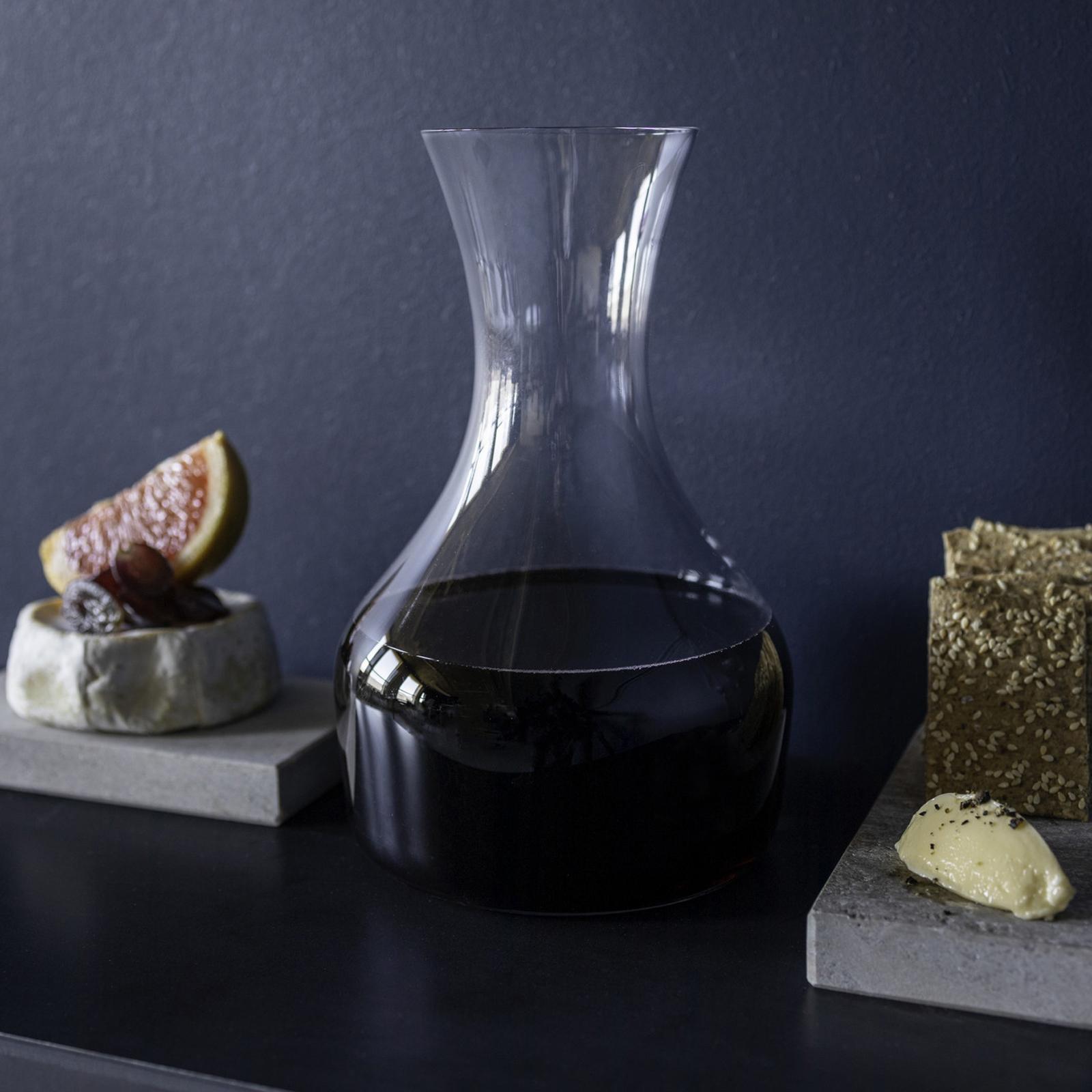 Share Carafe holds 41.5 oz and acts as a stand-alone carafe, ideal for pairing with different glassware and collections for various drinks and occasions. The large carafe fits one bottle of wine but also works well for serving water or juice. Designed by Pia Törnell.