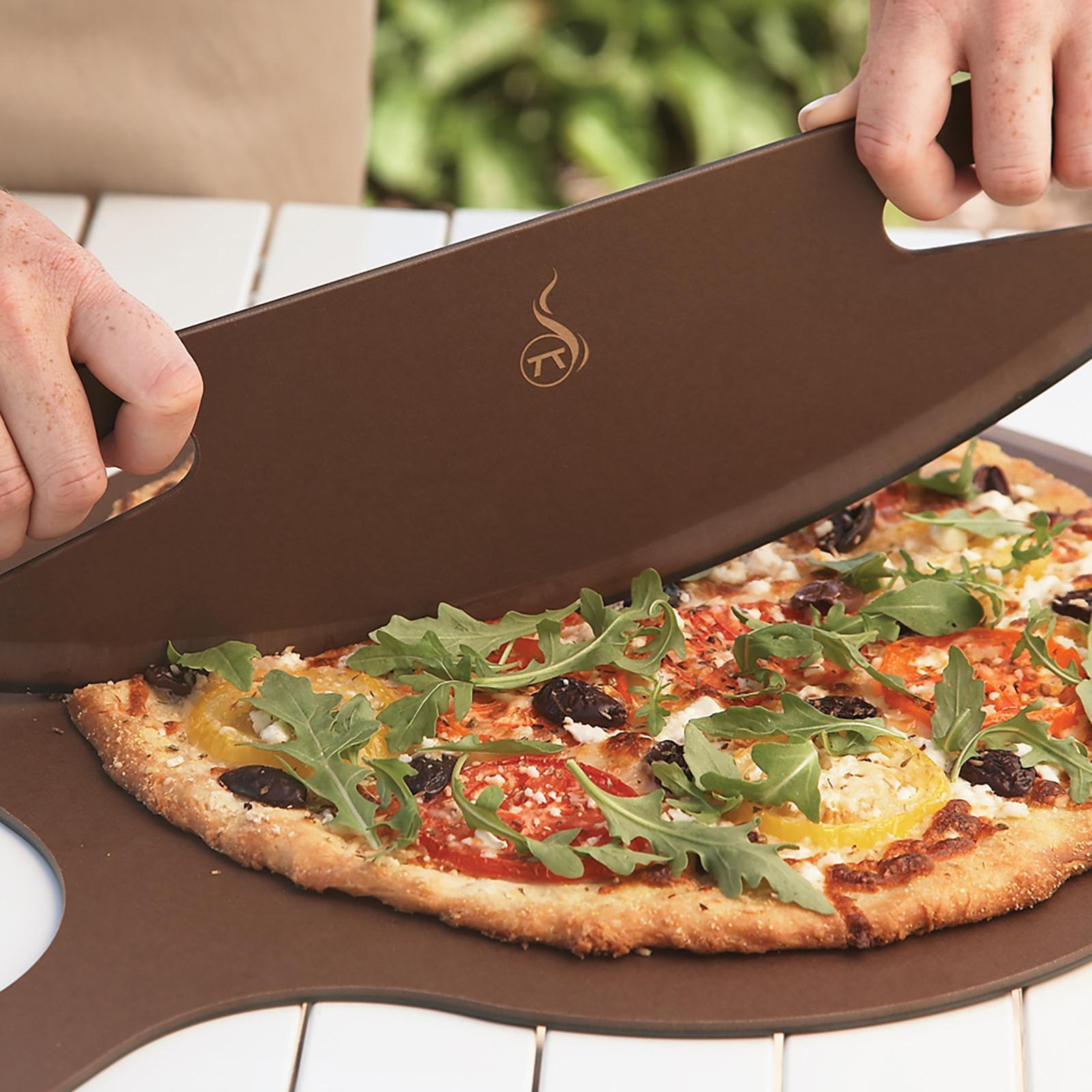 When it comes to pizza, this is cutting edge stuff. Better than the tiny pizza wheel, this phenolic paper curved guillotine slices pizza quickly, cleanly and evenly, but has no sharp edges that will damage your counter or get dull. It's also dishwasher-safe. Get ready to rock.