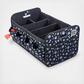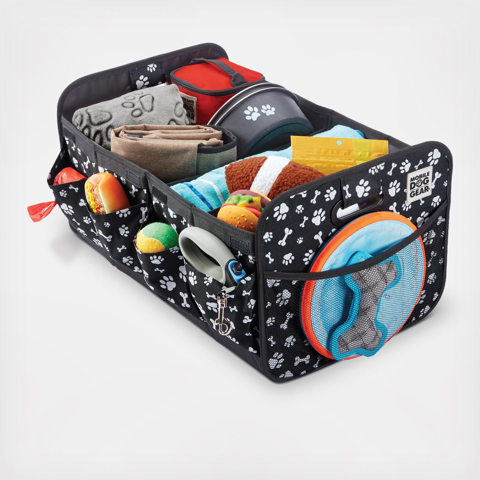 Our Mobile Dog Gear Collapsible Multipurpose Organizer will allow you to easily organize, store and bring your dog's essentials while you travel! This portable trunk organizer features: Removable dividers that attach securely and create up to six storage compartments, hook and loop fasteners on the sides secure the organizer in half or fully collapsed position, convenient built in waste bag dispenser and non-skid bottom. The deep and roomy mesh and side pockets are perfect for holding leash, frisbee, water bottles and more. The main compartments are ideal for holding larger items such as blankets, towels, large toys, bowls, food and treats. Our portable organizer is perfect for car trunk or SUV/van cargo areas, home offices, garages or anywhere you need to clean up and get organized. No more searching your home top to bottom for your pet's belongings! This multi-compartment collapsible portable trunk organizer keeps things neatly organized and all in one place. When you are ready to store the car trunk organizer, simply remove the dividers and fold! This car and SUV trunk organizer is fully lined and made from durable polyester, which is resistant to ripping and tearing. Also featured is a waterproof bottom so you won't have to worry about the inside contents getting wet. Top it all off with the reinforced handles that allow you to easily carry your bag to and from your vehicle.