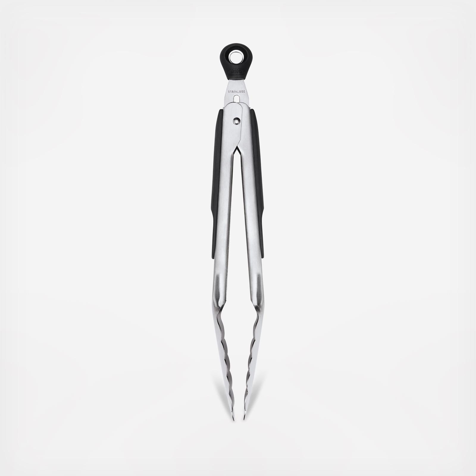 Sturdy and comfortable for effortless grabbing and flipping. These tongs feature brushed stainless steel with soft, non-slip handles and comfortable thumb rests. Easily lock in the closed position for convenient storage. The large pull-tab for locking also doubles as a hole for hanging.