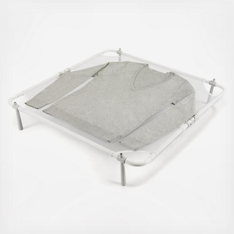 OXO's Folding Sweater Dryer's generously sized mesh drying surface lets clothes aerate while lying flat, making it ideal for heavier delicates like sweaters and blouses. Legs are offset from corners to provide maximum drying space even on smaller surfaces like countertops, washing machines or dryers.