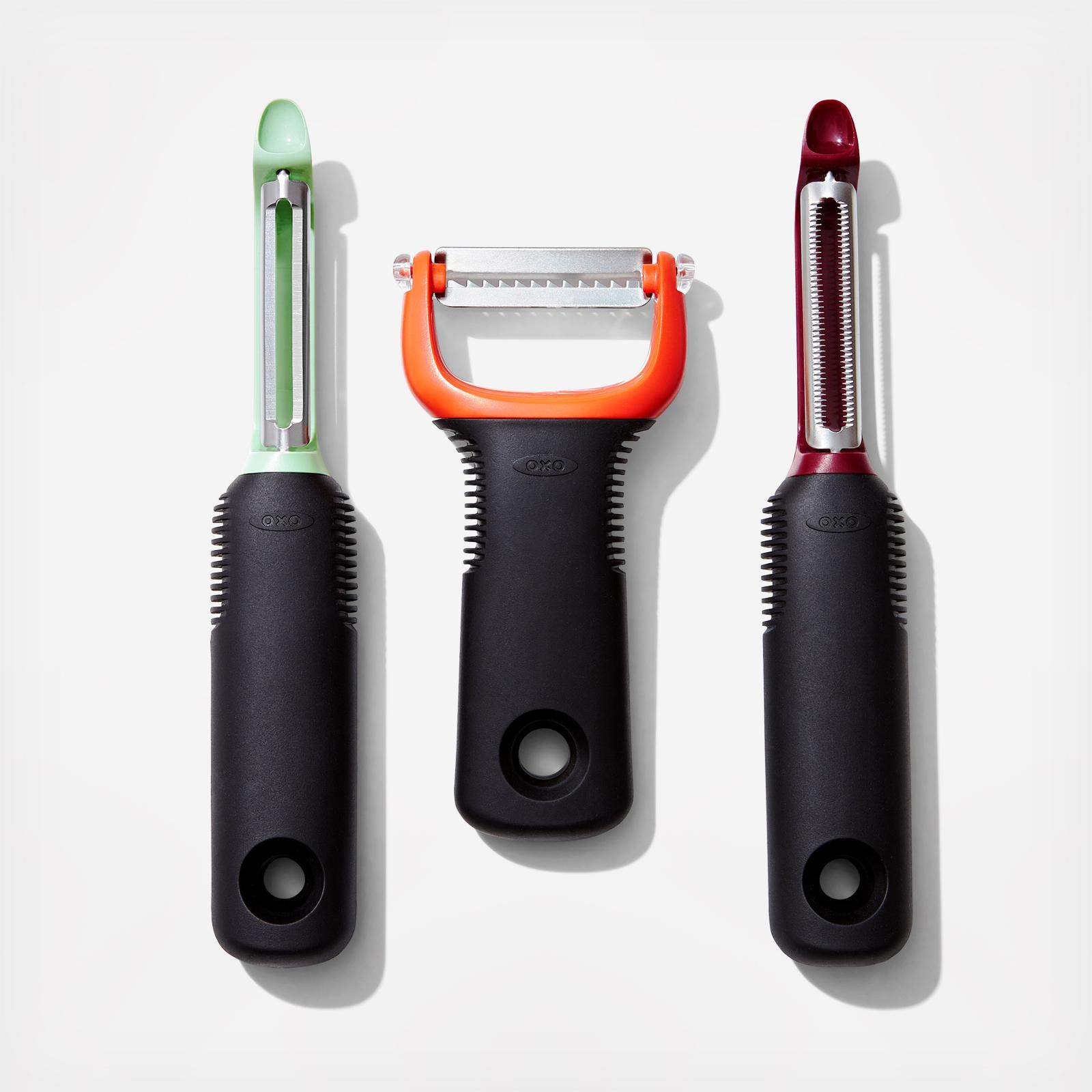 Whether you’re peeling a mountain of potatoes, julienning carrots for slaw, or prepping peaches for your favorite pie, the Good Grips 3-Piece Assorted Prep Peeler Set is up to the task. Our took the best features from our original, iconic peelers and incorporated them into the comfortable, y-peeler design. Each Peeler has an easy to maneuver shape tailor made for effortless prep no matter the fruit or vegetable. Sharp, rustproof, Japanese stainless steel blades are built for precision, while ergonomic handles and compact design fit nicely in your hand and kitchen drawers. The signature grips will never slip, even when wet.
