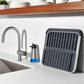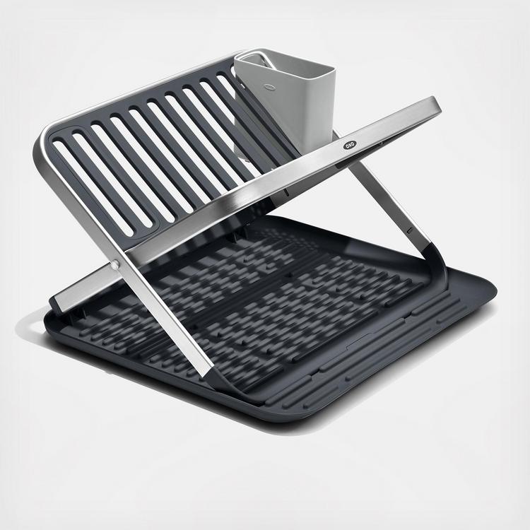 The Good Grips Aluminum Fold Flat Dish Rack is the flexible solution for doing dishes by hand. The rustproof aluminum frame has a two layer design that holds items of all sizes, and it’s customizable with a removable utensil cup that can be placed on either side of the Rack. It folds completely flat, making it ideal for use as a drying board for smaller loads as well as compact for easy storage. The built in drain board features raised ridges that elevate items away from water for quick, efficient drying, and non slip feet help keep the Rack stable on countertops. The clean design complements any kitchen.