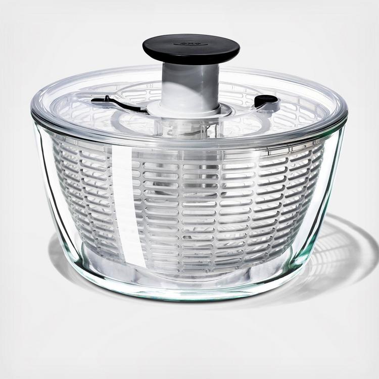 The Good Grips Glass Salad Spinner is the quick and easy way to dry greens or herbs—just press the soft, non-slip knob. The spinning basket doubles as a colander, so you can rinse lettuce and more with ease. The non-slip base prevents skidding, and the patented built-in brake button stops the Spinner on a dime for unloading. Toss and serve your salad right in the elegant glass bowl: It’s made of durable borosilicate glass and moves seamlessly to the table. Simply slide the lock to hold the pump flush with the lid for compact storage. The lid comes apart for thorough cleaning. Bowl capacity is 5.9 L/6.2 qt; basket capacity is 4.1 L/ 4.4 qt.