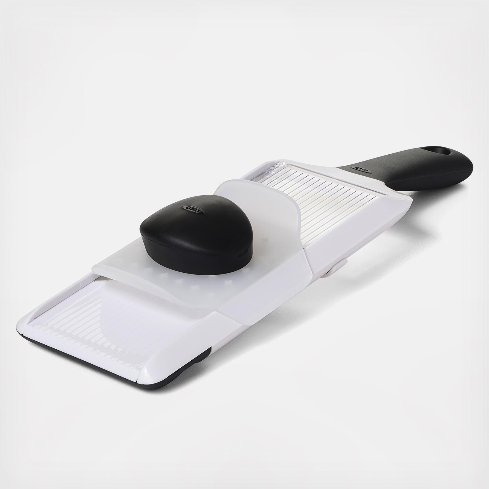 Making a cucumber salad, apple tart or potato gratin? The Hand-Held Mandoline Slicer can help. Slide the thickness adjuster to select slice thickness; choose from 1mm, 2.5mm and 4mm. Then secure food to holder and slide over the stainless steel blade for perfect, even slices. The clear surface shows slices accumulating below. Slice on cutting board or plate, or hook over a bowl. Food holder also covers blade when not in use