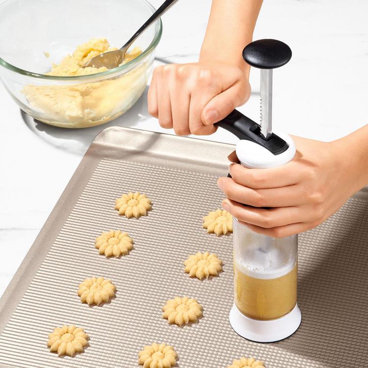 With OXO's cookie press you can make consistently shaped cookies with a simple pump of the large, comfortable lever. Disassembles for easy loading and cleaning.