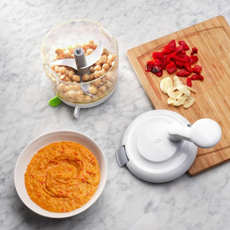 Whip up anything from pesto to guacamole with the OXO One Stop Chop Manual Food Processor. The sharp blades cut through fruits, vegetables, nuts, and more. Whether you’re chopping tomatoes into larger chunks for salsa or puréeing chickpeas for hummus, the texture is up to you and how many times you turn the comfortable handle. Easy to use, easy to clean, easy to impress your friends with your homemade creation.