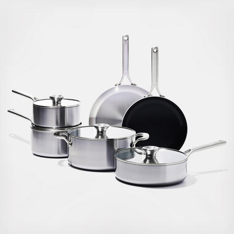 The Mira Tri-Ply stainless steel collection is high-performance tri-ply built for modern kitchens. Each piece is crafted with two stainless steel layers and a heat-radiant aluminum core to deliver fast and even cooking. A stain-resistant finish on each exterior prevents heat discoloration. The mix of ceramic non-stick and uncoated cookware provides non-stick ease and stainless steel durability. The ceramic non-stick coating is free of PFAS, PFOA, lead, and cadmium. Lightweight, contoured stainless steel handles keep cooking comfortable while the streamlined rivets eliminate food traps for a seamless, snag-free interior. Permanent markings on interior walls of the saucepans, stock pot, and saute pan are great for adding stock, water, milk and other liquid ingredients. Clear, tempered glass lids make it easy to check the progress of your dish without losing heat and the double-duty knobs on each lid flips to create a rest area for tools and keep your countertop clean. The durable, all-metal construction is perfect for all stovetops, including induction, and can move directly from the stovetop to oven or the broiler.