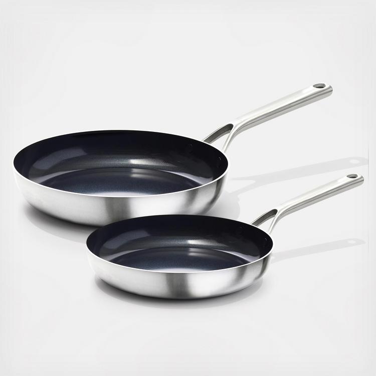 The Mira Tri-Ply stainless steel collection is high-performance tri-ply built for modern kitchens. This non-stick frying pan is a must for a classic breakfast, and perfect for sauteed veggies or smaller meals. The pan is crafted with two stainless steel layers and a heat-radiant aluminum core to deliver fast and even cooking. A stain-resistant finish on the exterior prevents heat discoloration. The powerful ceramic non-stick coating is infused with diamonds to deliver remarkable non-stick ease. Plus, the ceramic non-stick coating is free of PFAS, PFOA, lead, and cadmium. A lightweight, contoured stainless steel handle keeps cooking comfortable while the streamlined rivets eliminate food traps for a seamless, snag-free interior. The durable, all-metal construction is perfect for all stovetops, including induction, and can move directly from the stovetop to oven or the broiler.