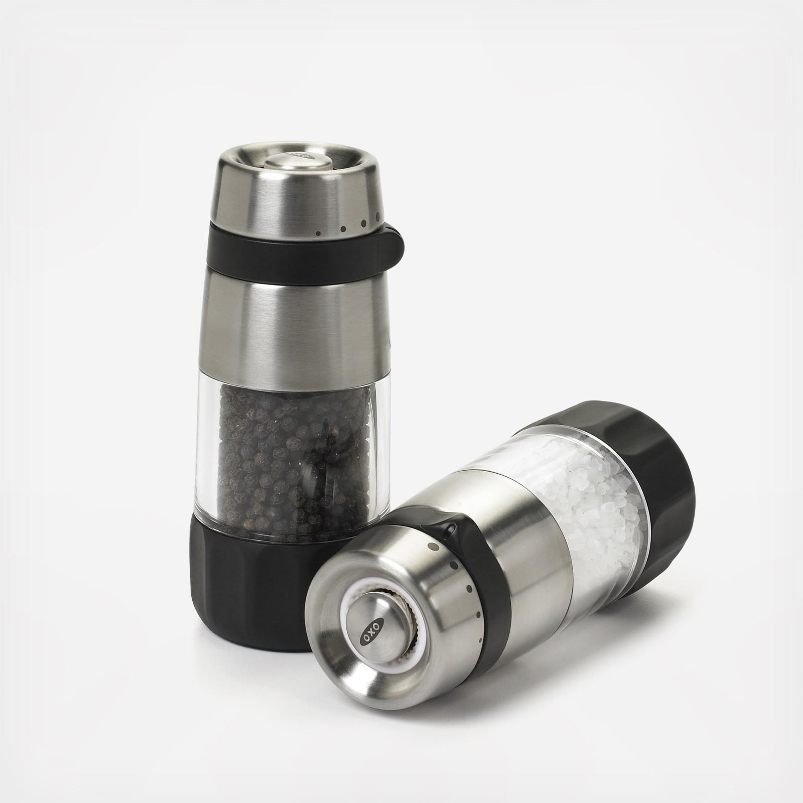 Add a dash of salt and a bit of pepper with ease! The stainless OXO Good Grips Salt Grinder and Pepper Grinder are perfect for cooking in the kitchen and elegantly designed to bring to the table. The Grinders are easily adjustable from fine to coarse grind and rest flat when upside down for easy refilling. The Grinders have a soft, non-slip grip for comfortable grinding and are sold filled with sea salt and black peppercorns.