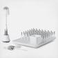 The OXO Tot Cleaning Essentials for Bottles & Cups system makes cleaning baby bottles and cups easy. Durable yet soft bristles allow for serious scrubbing while still being safe for glass baby bottles. Included bottle brush easily reaches into tall bottles to scrub away while the drying rack fits perfectly on your counter. Convenient stand stores the Brush in two positions to keep the bristles away from germs and also features a pour spout for easy cleaning. Brushes have non-slip handles.