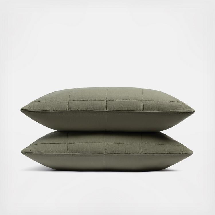 These quilted shams add a decorative element to your top of bed and are made of 100% garment washed linen on the front face and stonewashed percale on the reverse. Featuring box quilting pattern with tonal stitching detail on the front face. 100% poly batting fill. Oeko-Tex certified.