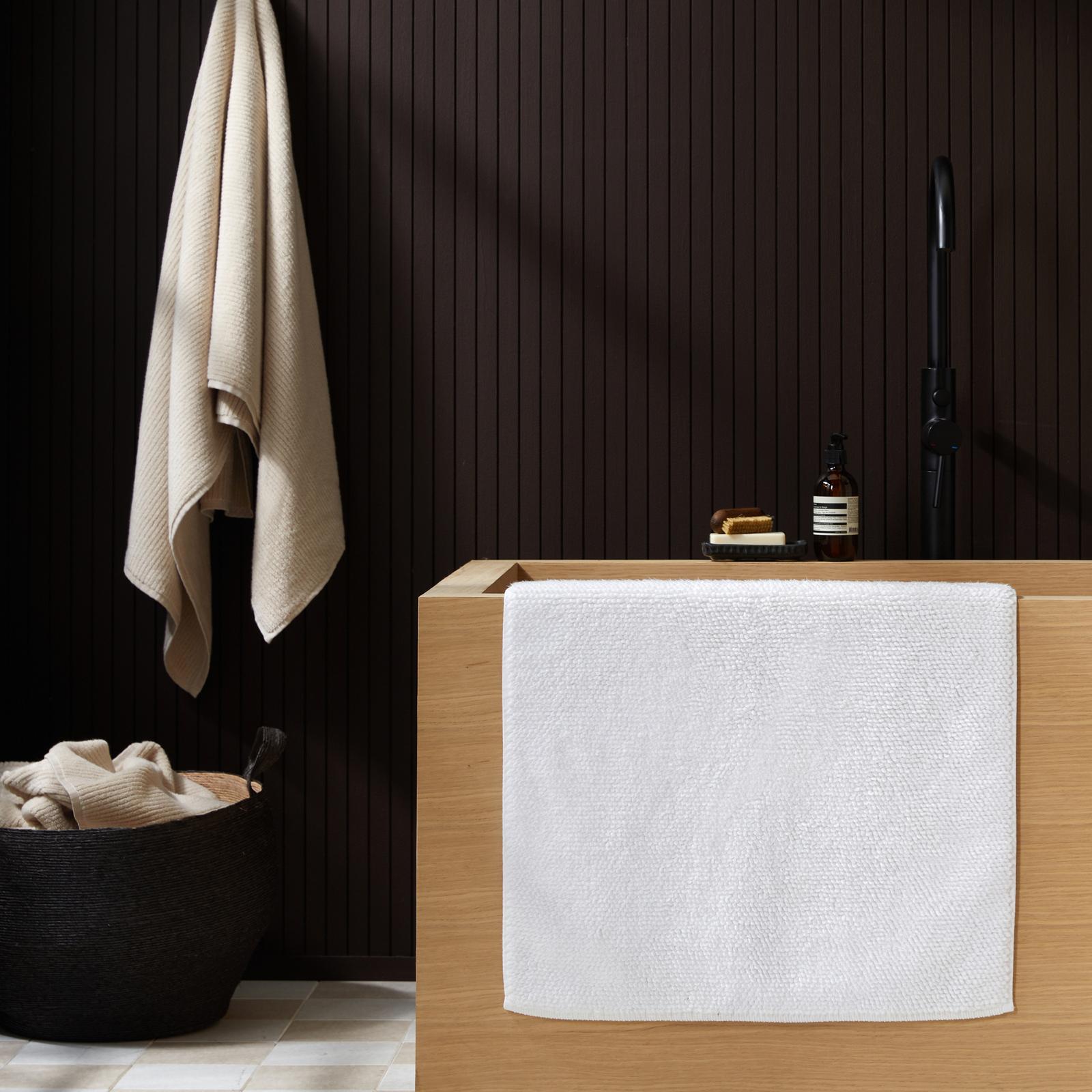 Soft, absorbent and warm underfoot, this rug adds comfort and style anywhere in the bathroom. Available in a tubside size and a long runner, fit for a Jack and Jill sink.