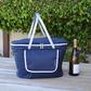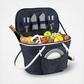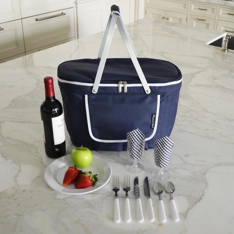 The new collapsible picnic basket with place settings for 2, is both elegant and practical. Constructed with a lightweight aluminum frame and handles, it is durable and easy to collapse and open. Features include a waterproof PEVA lining, Thermal Shield insulation system, and padded hand grip. Picnic components fit neatly in front and back external pockets, leaving the cooler area unobstructed, for easy packing. The lid zips fully closed and is insulated as well for maximum cooler efficiency. Great for all outdoor events. Lifetime Warranty.