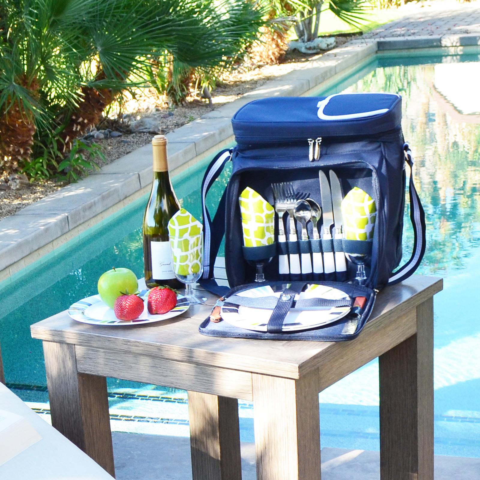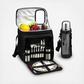 This fully equipped picnic & coffee basket cooler for two has a unique, divided Thermal Shield insulated cooler with separate sections for wine and food. The divider can be detached and folded to the back when a larger cooler space is needed. It also features an easy drinks access panel in lid. The cooler is leak proof so may be used with ice to extend cooling, and has an adjustable shoulder strap & extra front pocket. Lifetime warranty.