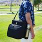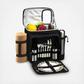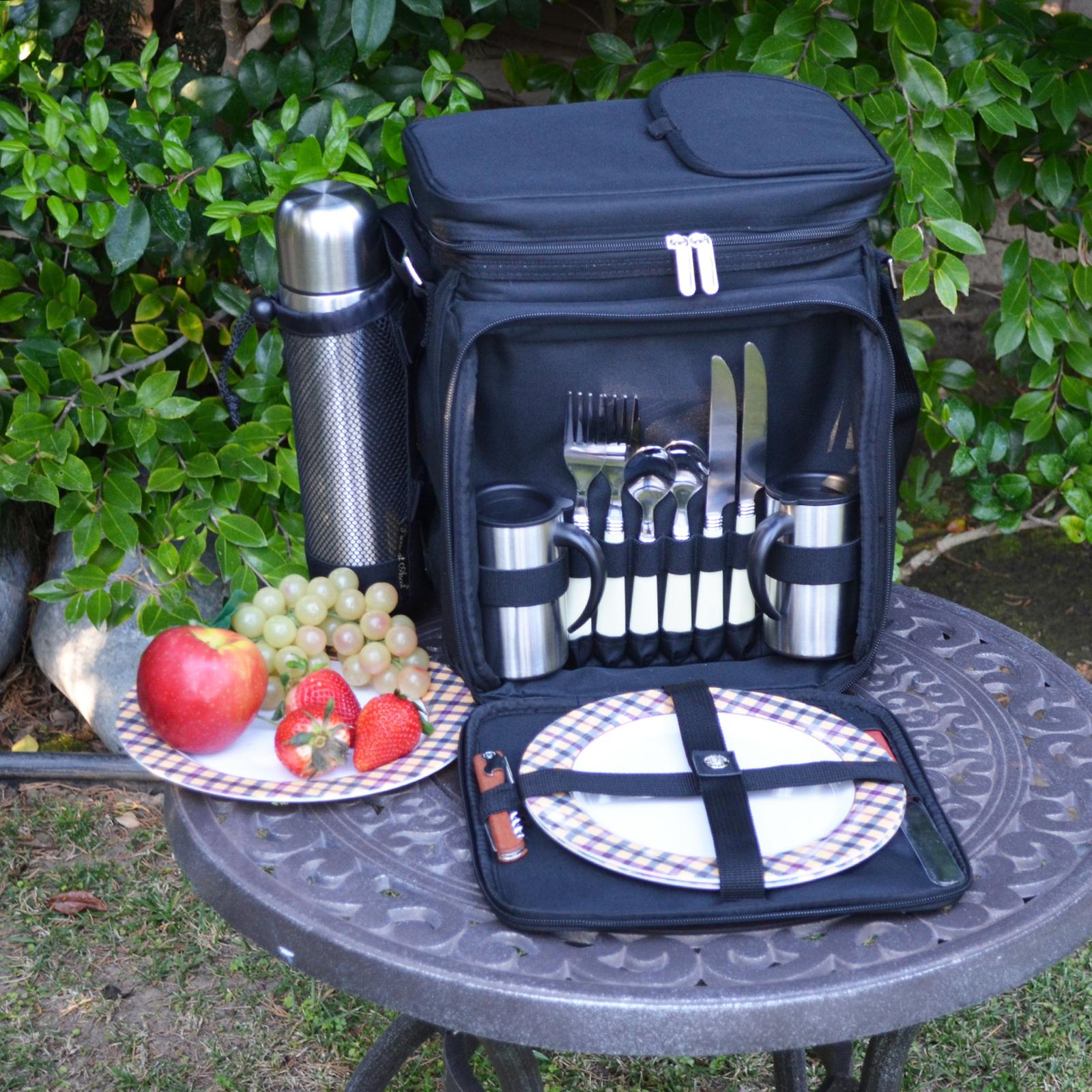 This fully equipped picnic & coffee basket cooler for two has a unique, divided Thermal Shield insulated cooler with separate sections for wine and food. The divider can be detached and folded to the back when a larger cooler space is needed. It also features an easy drinks access panel in lid. The cooler is leak proof so may be used with ice to extend cooling, and has an adjustable shoulder strap & extra front pocket. Lifetime warranty.
