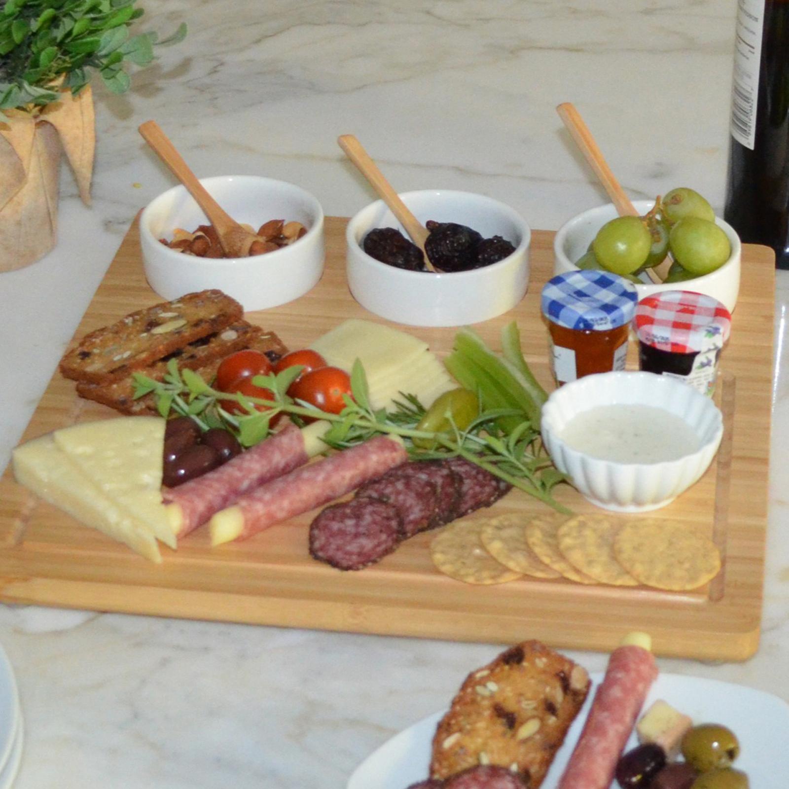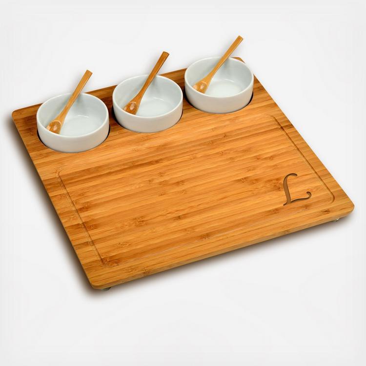 This unique Bamboo Serving Tray includes three removable ceramic bowls and 3 small bamboo serving spoons. The bowls are inset in the board for stability but are removable to re-fill and/or clean. The board has gracefully rounded corners, a milled juice grove, and permanent clear protective, non-slip feet. It's a great size for a casual party and makes an excellent wedding or welcome gift. Lifetime Warranty.