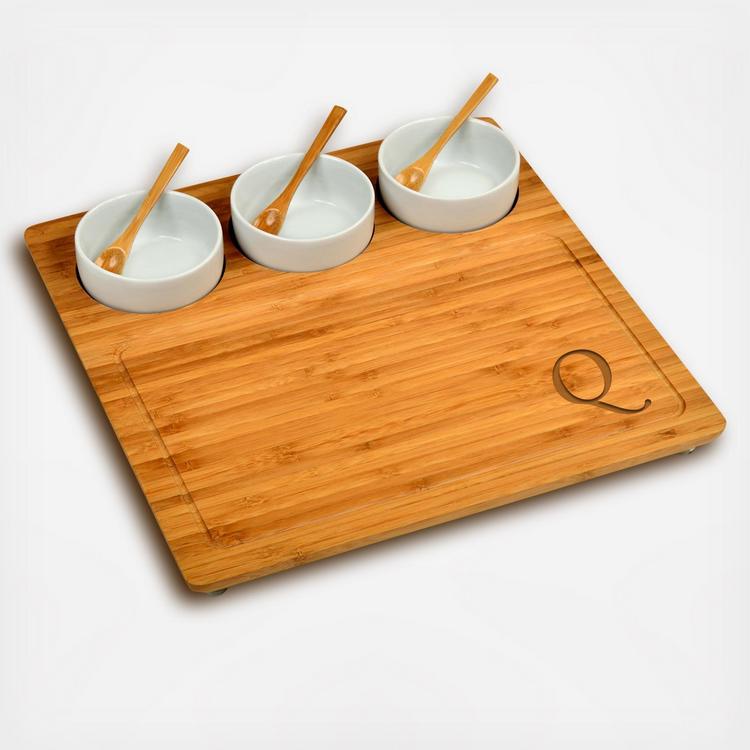 This unique Bamboo Serving Tray includes three removable ceramic bowls and 3 small bamboo serving spoons. The bowls are inset in the board for stability but are removable to re-fill and/or clean. The board has gracefully rounded corners, a milled juice grove, and permanent clear protective, non-slip feet. It's a great size for a casual party and makes an excellent wedding or welcome gift. Lifetime Warranty.