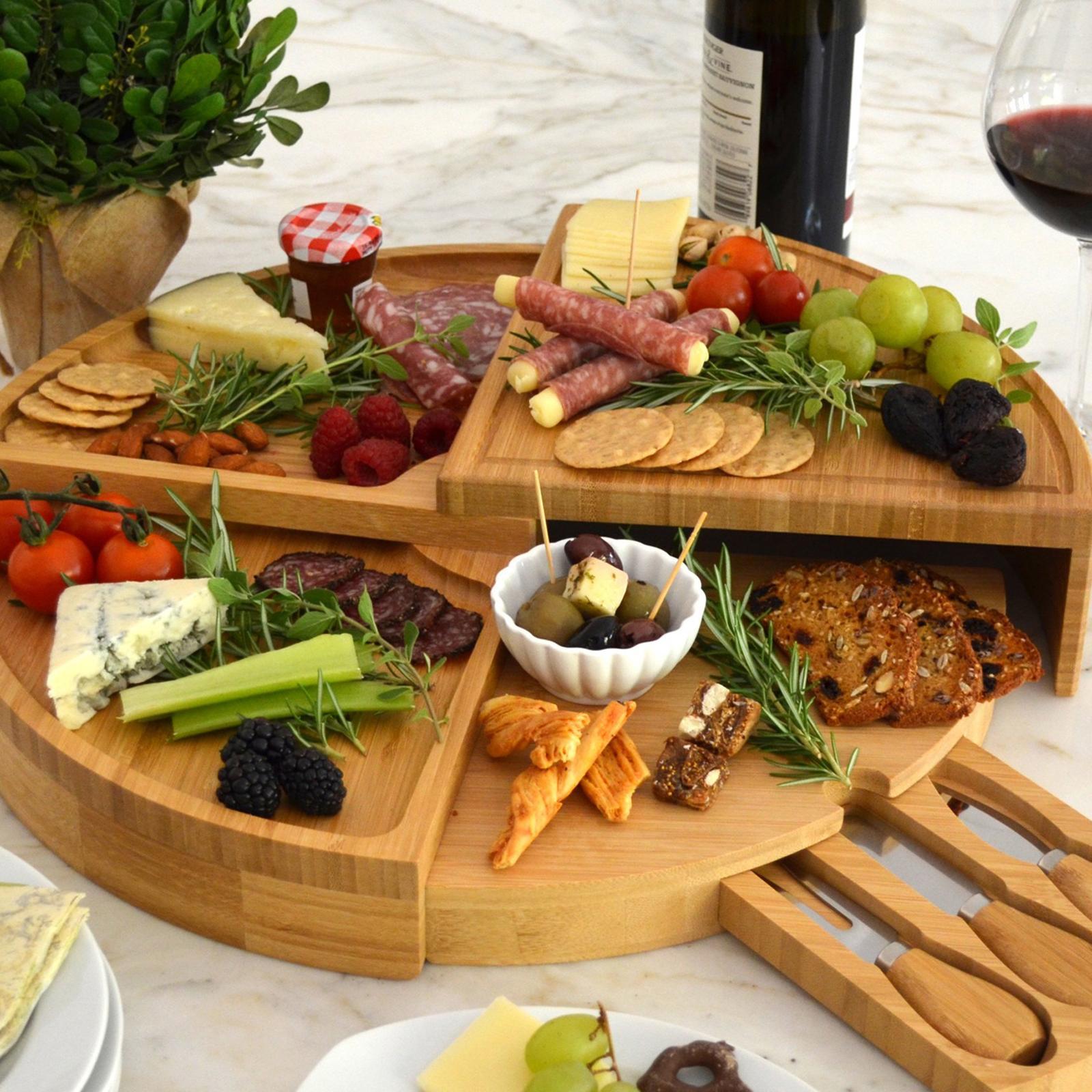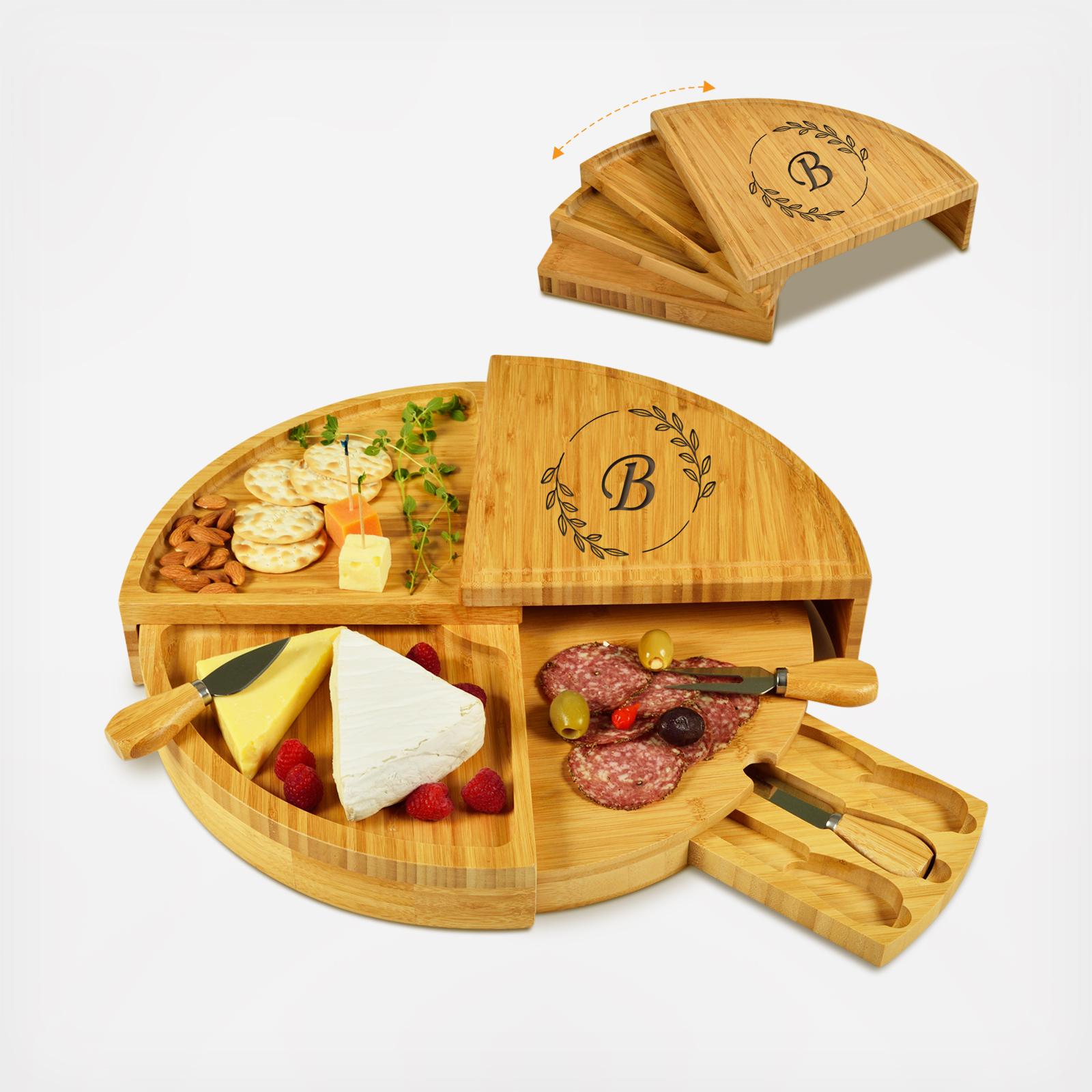 Personalized Bamboo board that amazingly transforms from circular, multi level cheese board with three stainless steel tools in a hidden pull out drawer plus cheese markers. This ingenious design provides support to all levels even when completely open and the pull out drawer is completely hidden when closed. This high quality board will impress guests when entertaining, and is a unique and special upscale gift. The drawer is removable for cleaning. Designed in the USA. Lifetime Warranty.