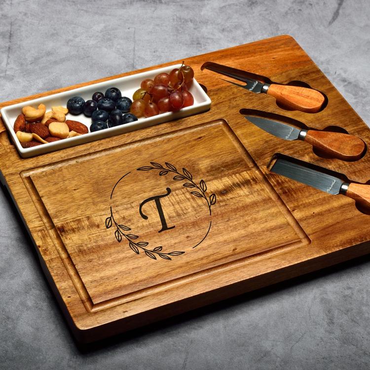 This elegant Personalized Cheese board/Charcuterie set are stainless steel with acacia handles.