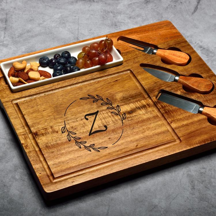 This elegant Personalized Cheese board/Charcuterie set are stainless steel with acacia handles.