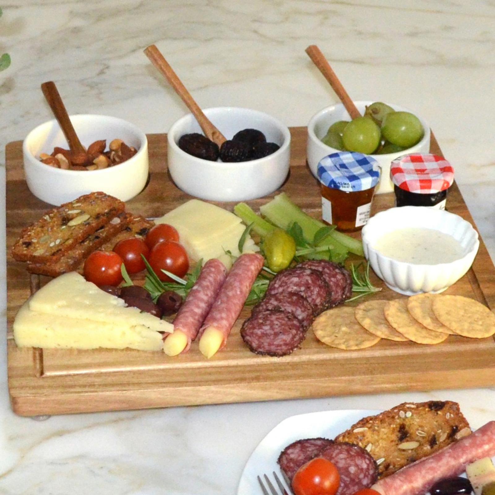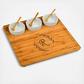 This unique Personalized Serving Tray with bowls are inset in the board for stability but are removable to re-fill and/or clean. The board has gracefully rounded corners, a milled juice grove, and permanent clear protective, non-slip feet. It's a great size for a casual party and makes an excellent wedding or welcome gift.