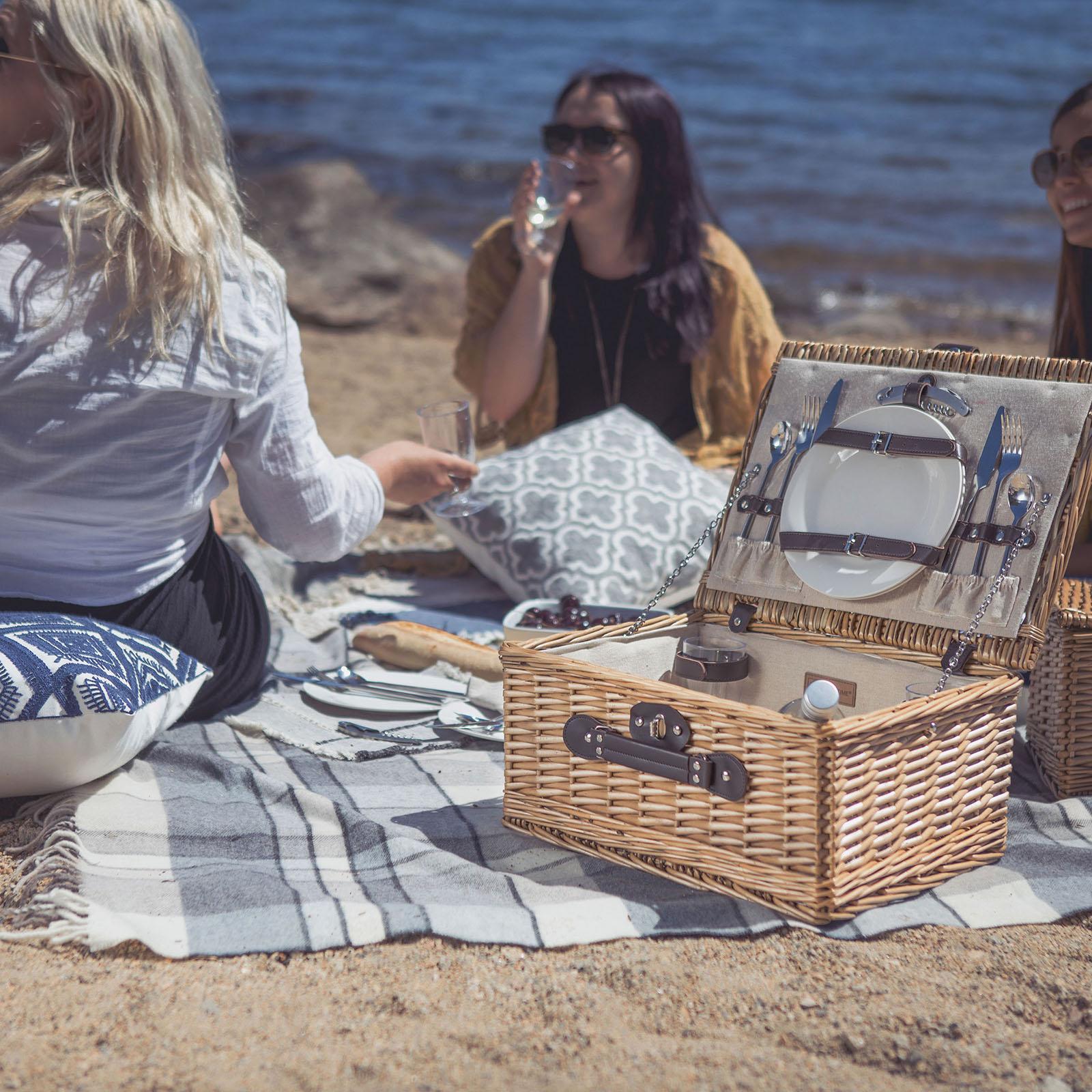 When you close your eyes and picture a willow wicker picnic basket with full picnic set for 2, durable lining, and English-inspired vintage styling with leatherette handles, you’re totally picturing the Classic Picnic Basket for 2. This all inclusive picnic set features plates and silverware for two, a stainless-steel waiter’s style corkscrew secured to the lid, and two wine glasses and napkins secured in the body of the basket. Large enough to carry all the wine and cheese necessary for a romantic dream picnic, but small enough to make it easy to carry to your destination, this basket makes an ideal wedding present, anniversary gift, or just because token of affection.
