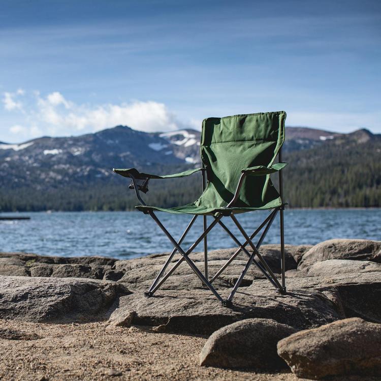 The PTZ Camp Chair is a portable camp chair that folds compactly and sets up in seconds. The chair has extra-long armrests and is designed so the seat back is slightly reclined for a more comfortable seating position, with the seat being 16" from the ground. It includes a mesh cup holder in the right armrest and a carry bag with shoulder strap.
