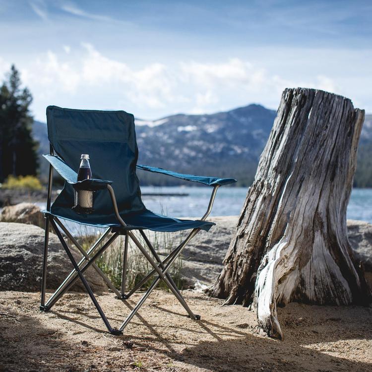 The PTZ Camp Chair is a portable camp chair that folds compactly and sets up in seconds. The chair has extra-long armrests and is designed so the seat back is slightly reclined for a more comfortable seating position, with the seat being 16" from the ground. It includes a mesh cup holder in the right armrest and a carry bag with shoulder strap.