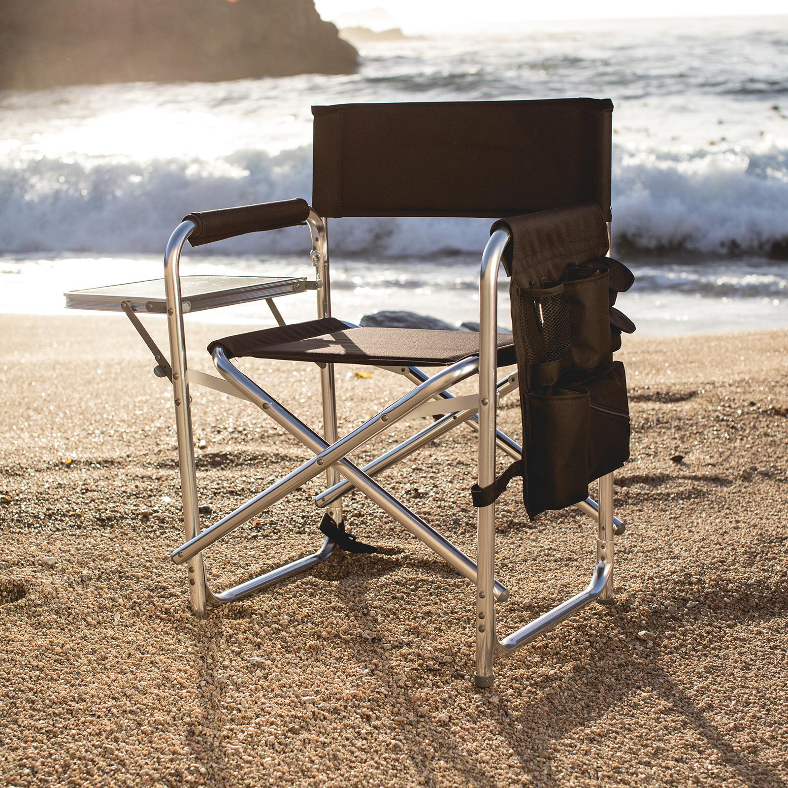 It's a beach chair for grownups and a camp chair for adults - the Sports Chair with Side Table is the last and greatest portable outdoor folding chair you’ll ever need. With classic lines and modern touches, this smart travel chair is made of durable polyester canvas on a foldable and lightweight aluminum frame. Features abound on this lawn and picnic-ready directors chair with padded seat and armrests, fold-out side table, hanging arm rest caddy for holding books & magazines, two insulated beverage pockets, and a variety of additional pockets for extras. Grab-and-go with the underseat carrying handles or use the adjustable, detachable shoulder strap for longer treks to the campsite, the beach, or across the stadium. This outdoor camping chair is ideal for camping, picnicking, concerts in the park, or watching your favorite sport comfortably from the sidelines.