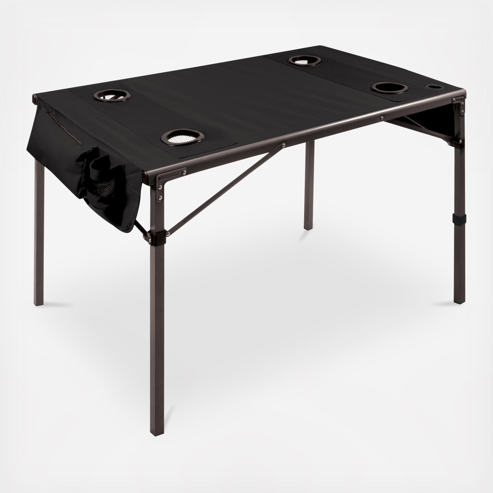 Get everything out on the table with the Travel Table Portable Folding Table, the ultimate compact folding table for camping, tailgating, beach days, picnics at the park and bbqs. High quality components include a sturdy polyester canvas skin that stretches over a durable, powder-coated steel frame. The frame folds inward to pack easily into a drawstring bag with a shoulder strap. Four sunken drink holders in the table top, two pouch drink holders on the sides, and a hanging, zippered pouch for personal items, plus a beach umbrella hole for build-in shade make this our downright favorite camping table.