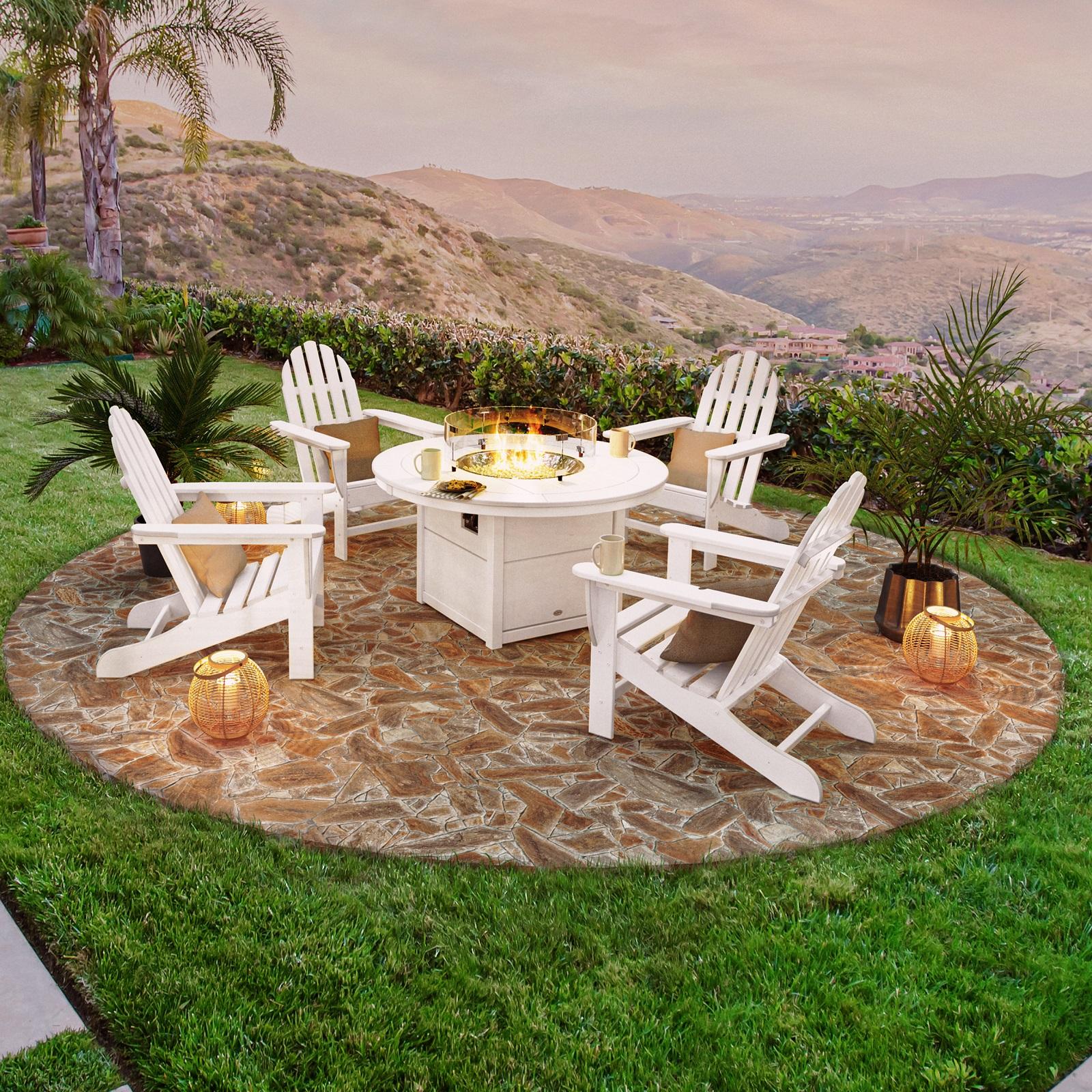 Enhance the ambiance of your outdoor space with the Classic Adirondack 5-Piece Conversation Set with Fire Pit Table. This all-weather set, which seats up to four, creates the perfect spot for family and friends to gather and relax. The Classic Adirondacks have a pleasing aesthetic and provide contoured comfort that won't be hindered by harsh weather. The coordinating fire pit table requires very little upkeep just like the Adirondacks, and it comes with its own protective cover.