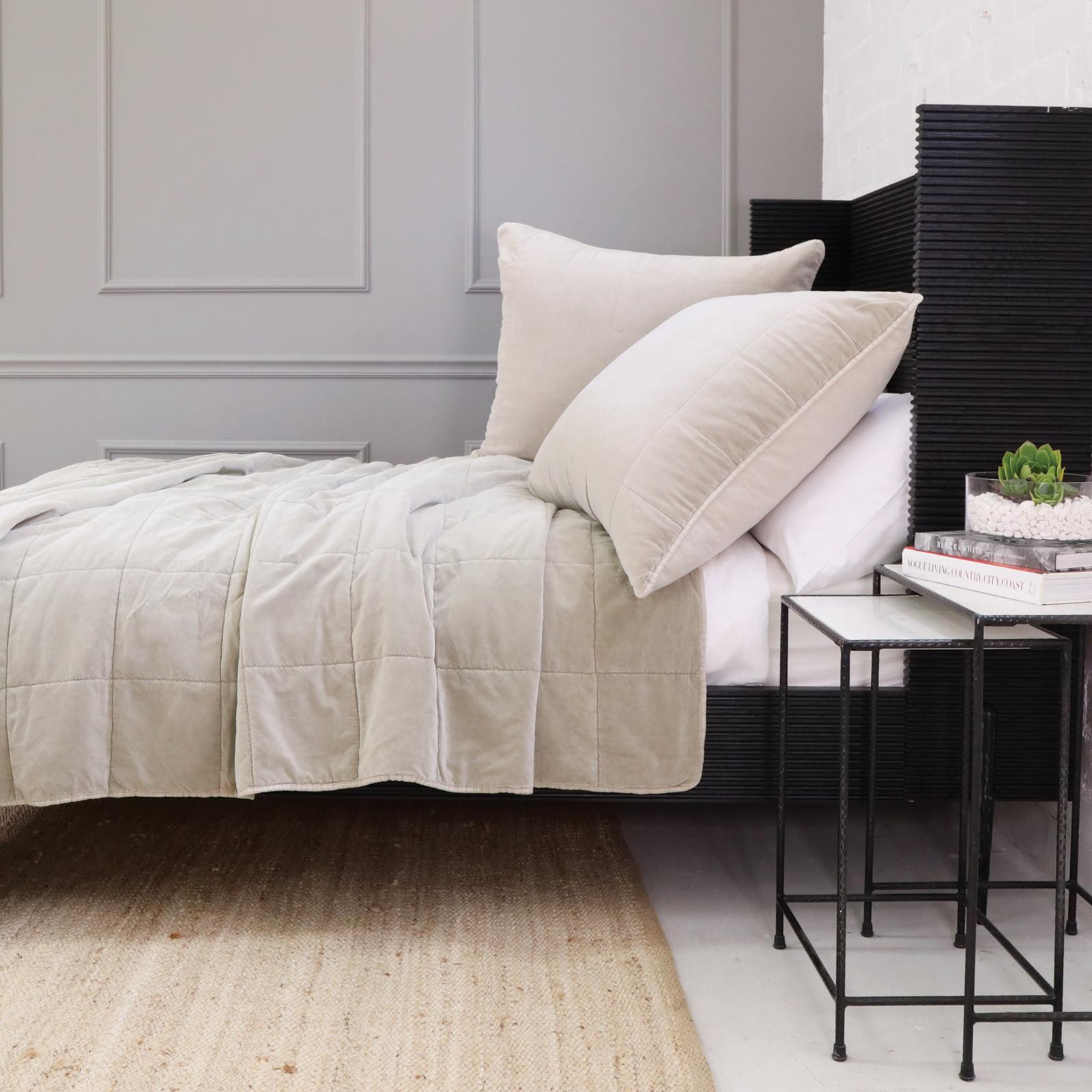 Stone washed for a soft hand feel, the Amsterdam Coverlet is a cotton velvet with a cotton backing. It features a quilted square pattern for a simple and modern look.
