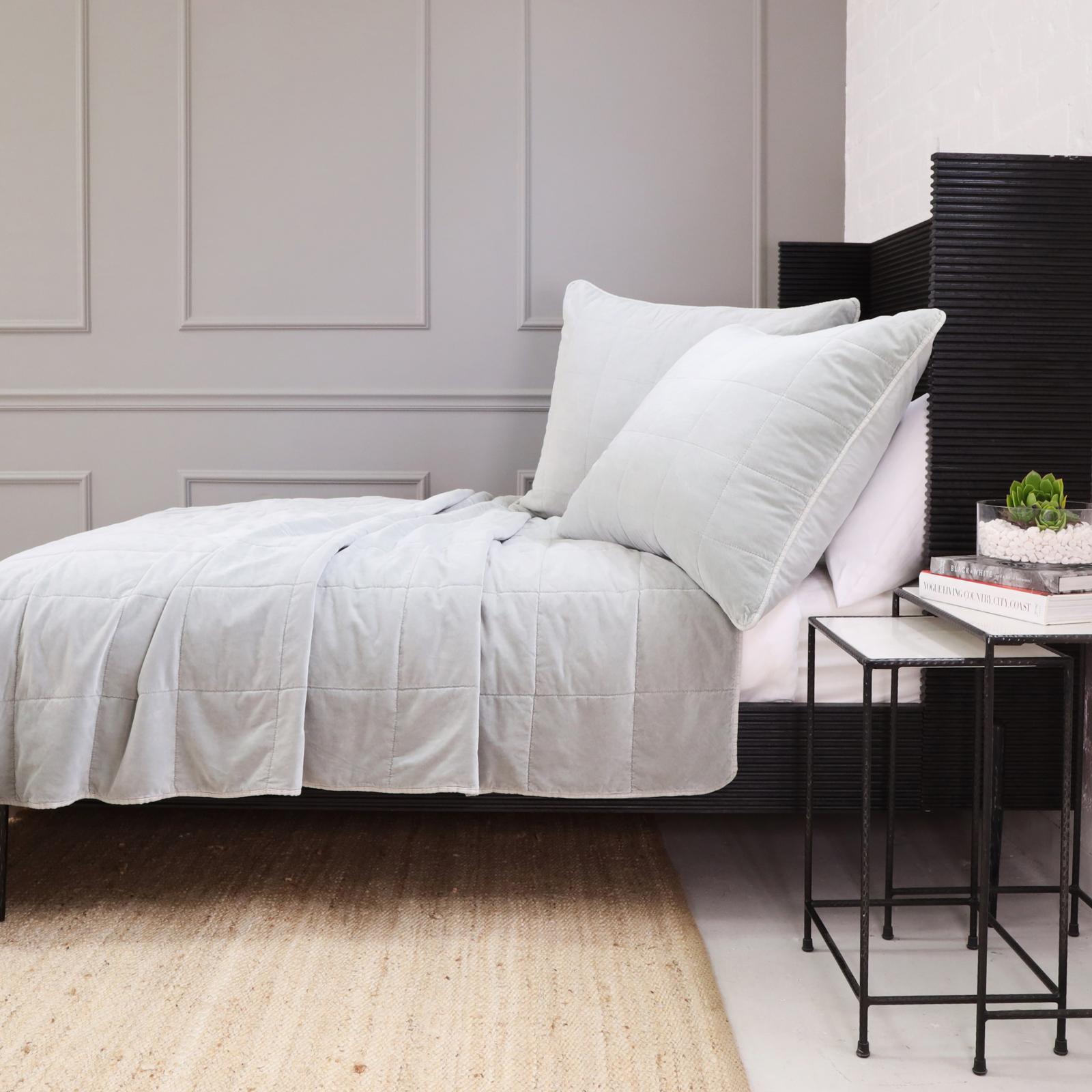 Stone washed for a soft hand feel, the Amsterdam Coverlet is a cotton velvet with a cotton backing. It features a quilted square pattern for a simple and modern look.