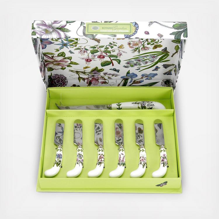 A wonderful addition to after dinner cheese, this Botanic Garden cheese knife and spreaders set from Portmeirion includes 1 cheese knife, which has a finely serrated knife edge and a fork at the end, and 6 spreaders. It makes an ideal gift.