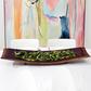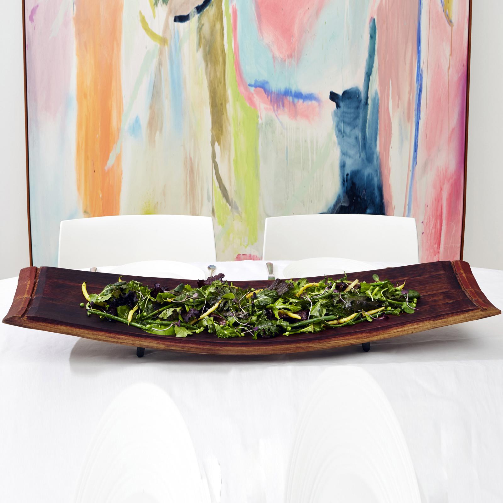 Our Barrel Bowl is a striking blend of sculptural form and functional design, handcrafted from the naturally curved staves of reclaimed oak wine barrels. Each piece retains the organic shape of the barrel, creating a long, graceful vessel that feels both architectural and grounded. The interior surface is richly colored with authentic red wine patina—an entirely natural stain formed through years of aging wine, making every bowl truly one of a kind.