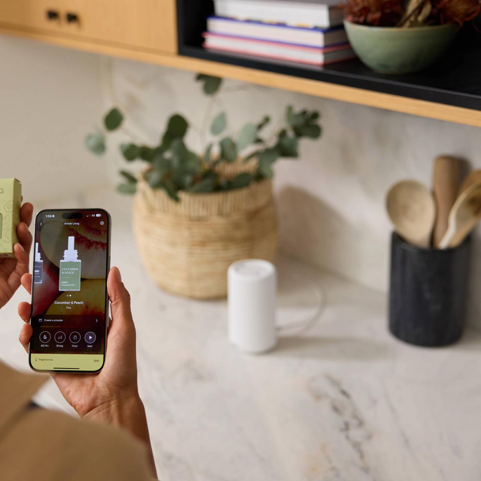 Designed For Large and open spaces Open concept and areas with vaulted ceilings. The next level in home fragrance innovation, Pura Plus™ quickly and completely fills large and open spaces with premium scent. With smart features, manual controls and more color options, designing your scentscape is now easier than ever.