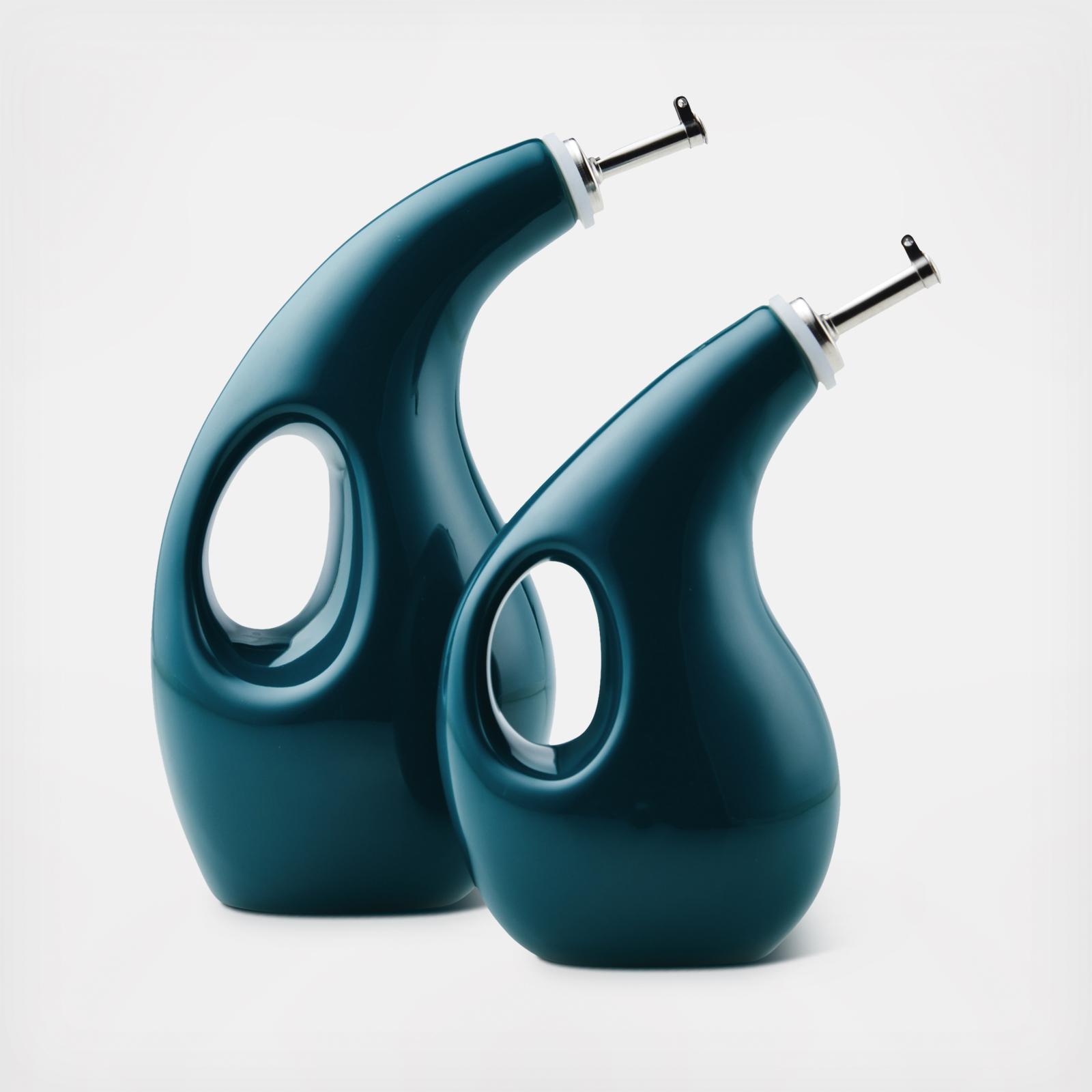 The ceramic bottles are opaque to protect oils and vinegars from oxidation, and have handles integrated into the design to make them easy to grab and comfortable to hold. The overall shape is both timeless and trendy, and the pouring spouts are proportioned to help deliver the ideal pour. For added convenience, the oil and vinegar EVOO bottle set is also dishwasher safe. Great as a bold display right on the countertop or table, this fun EVOO and vinegar bottle set is the perfect complement to many other items in their collections.