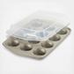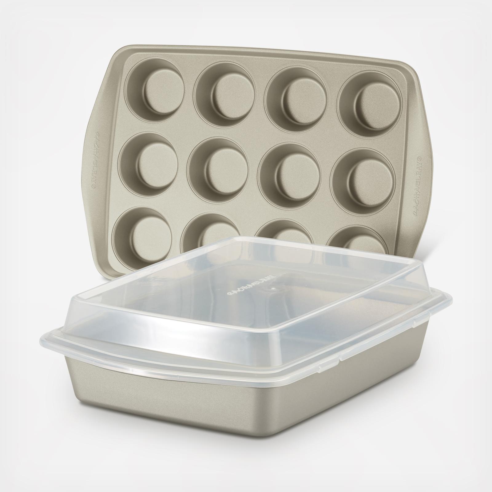 Grab the goodies and go with the Rachael Ray 3-Piece Silver Nonstick Bakeware Set that includes an innovative swing lid for covering baked goods, sides, and more. Made from heavy gauge steel, the pans resist warping and feature long-lasting nonstick that provides excellent food and baked goods release with easy cleanup. Rolled-rims provide a confident grip for easy handling, even with bulky oven mitts on, and the set is conveniently oven safe to 450°F (plastic cake pan and cupcake pan lid not intended for oven use). Although dishwasher safe for a quick cleanup, hand washing is recommended for the best and longest-lasting performance. Turn up the heat and bake some excitement with the Rachael Ray 3-Piece Silver Nonstick Bakeware Set.