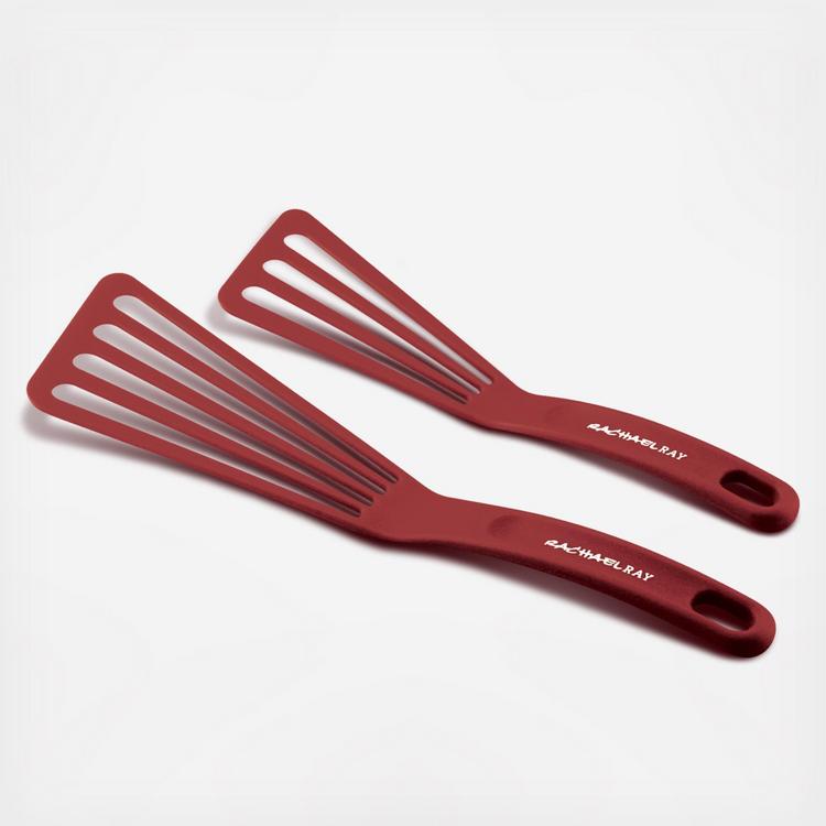 Do a flip, over the versatility, fun and convenience of the Rachael Ray Tools & Gadgets 2-Piece Nylon Turner Set. The sturdy, flexible and dynamic kitchen duo includes both a medium-length and longer turner to help with all sorts of kitchen tasks. The head on the large turner is great for handling a juicy ribeye while the medium turner is perfectly suited for slipping under delicate eggs for Rachael’s Steak and Eggs Rancheros. Even better, these handy nylon tools are ideal for use with all cookware surfaces, including nonstick. Heat safe to 400°F, the turners also feature durable, lightweight handles comfortable to grasp and gently curved to make it easier to get into pans and under even delicate fish filets. Dishwasher safe for convenience, these vibrant nylon turners coordinate well with other pieces in Rachael Ray’s fun and exciting collections. Flip, turn and lift a variety of yummy foods, and have a blast while doing it, with the Rachael Ray Tools & Gadgets 2-Piece Nylon Turner Set.