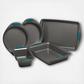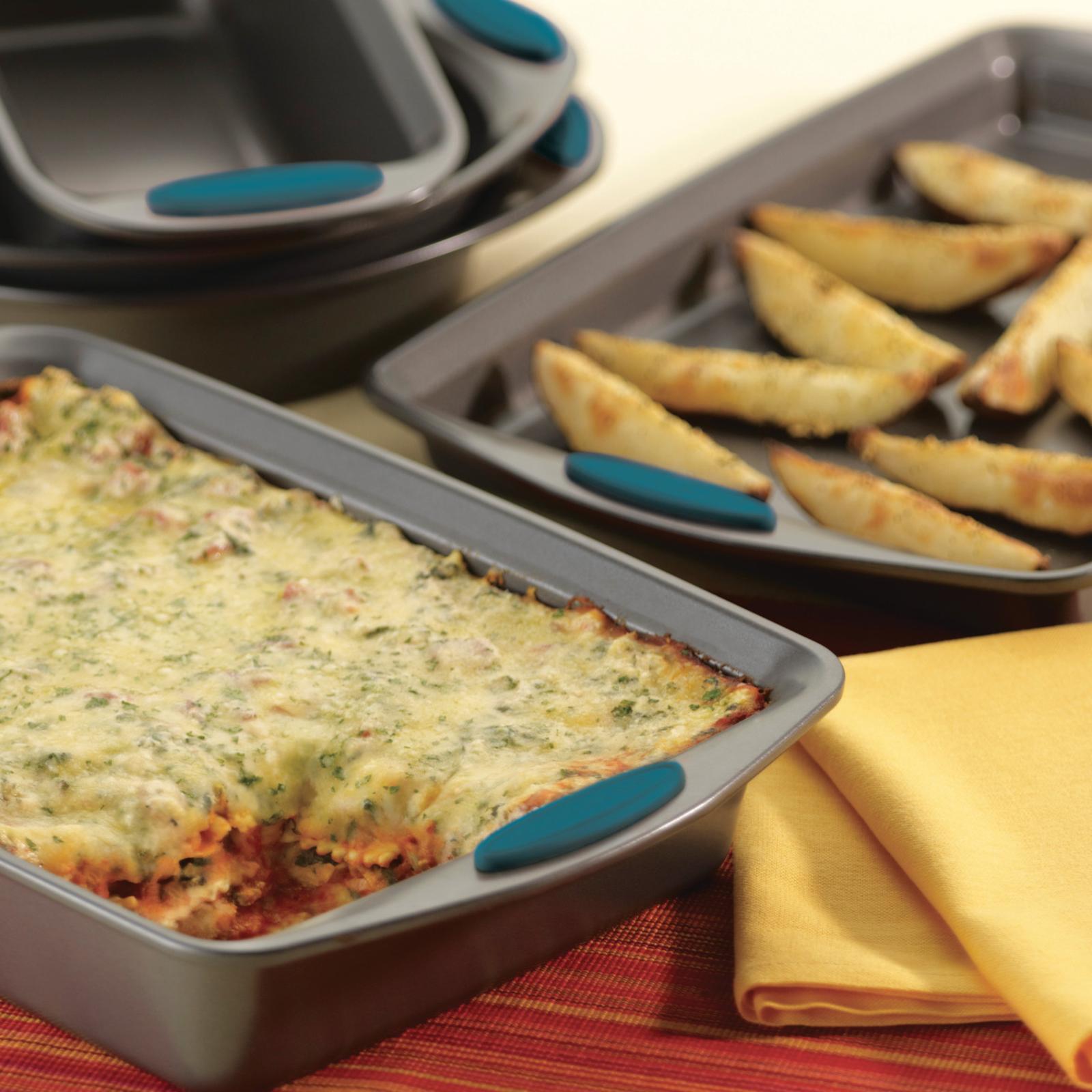 Take the guesswork out of assembling an essential bakeware collection with the versatile Rachael Ray Yum-o! Nonstick 5-Piece Oven Lovin’ Bakeware Set. This practical set can handle cakes, lasagna, meatloaf, roasted potatoes, brownies and more. Made from heavy gauge steel, the pans resist warping and feature long-lasting nonstick that provides excellent food and baked good release with easy cleanup. The pans' bold-colored, extra-wide grippy handles offer a confident grasp when pulling items from the oven, and they are oven safe to 500°F.