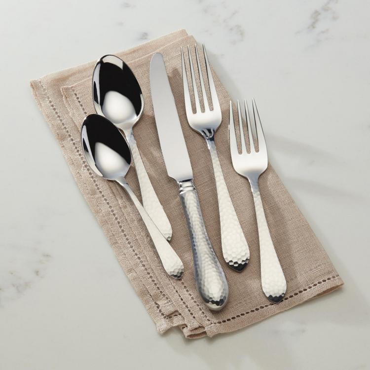 Proof that classic design never goes out of style, the Hammered Antique fine stainless flatware pattern from Reed & Barton is a versatile beauty that incorporates the look and feel of the finest hand-hammered metal. The teardrop shape is typical of a flatware design that appeared in the 18th century.Includes: - Place knife - Place fork - Salad fork - Soup spoon - Teaspoon