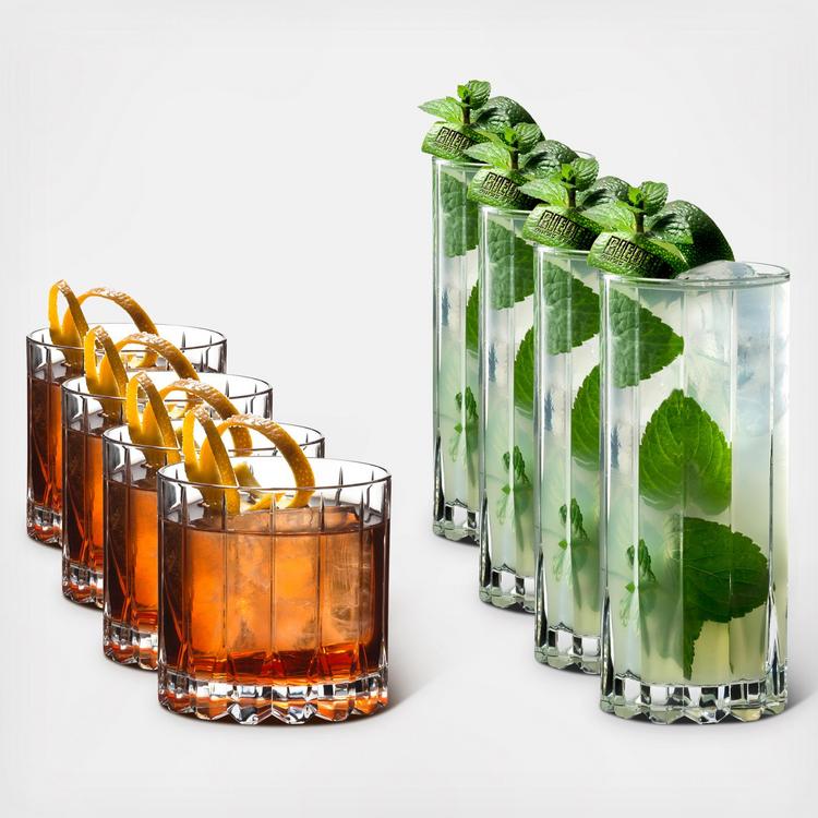 This barware drink specific glassware set is made up of rocks glasses and highball glasses. The perfect "Bar in a Box. The highball glass is ideal for mixed cocktails, with its tall shape maintaining effervescence, and is specially sized for large format ice. The rocks glass is perfect for spirits served on the rocks or mixed cocktails, and is specially sized for large format ice.