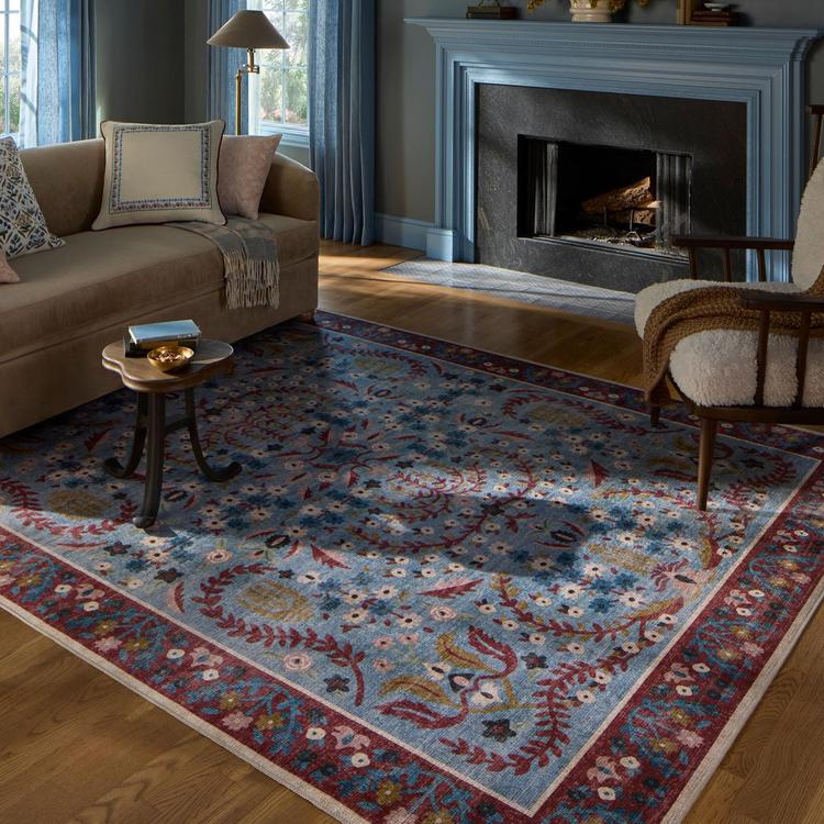 The Canopy Collection is a floral area rug with an enchanted forest design based on hand-painted artwork by Rifle Paper Co. in collaboration with Loloi. The whimsical design features lush scenes visited by charming woodland creatures, from prancing deer to beautifully plumed peacocks. This collection is power-loomed of a soft polyester in China, a durable construction for living room rugs, bedroom rugs, entryway rugs, and more.