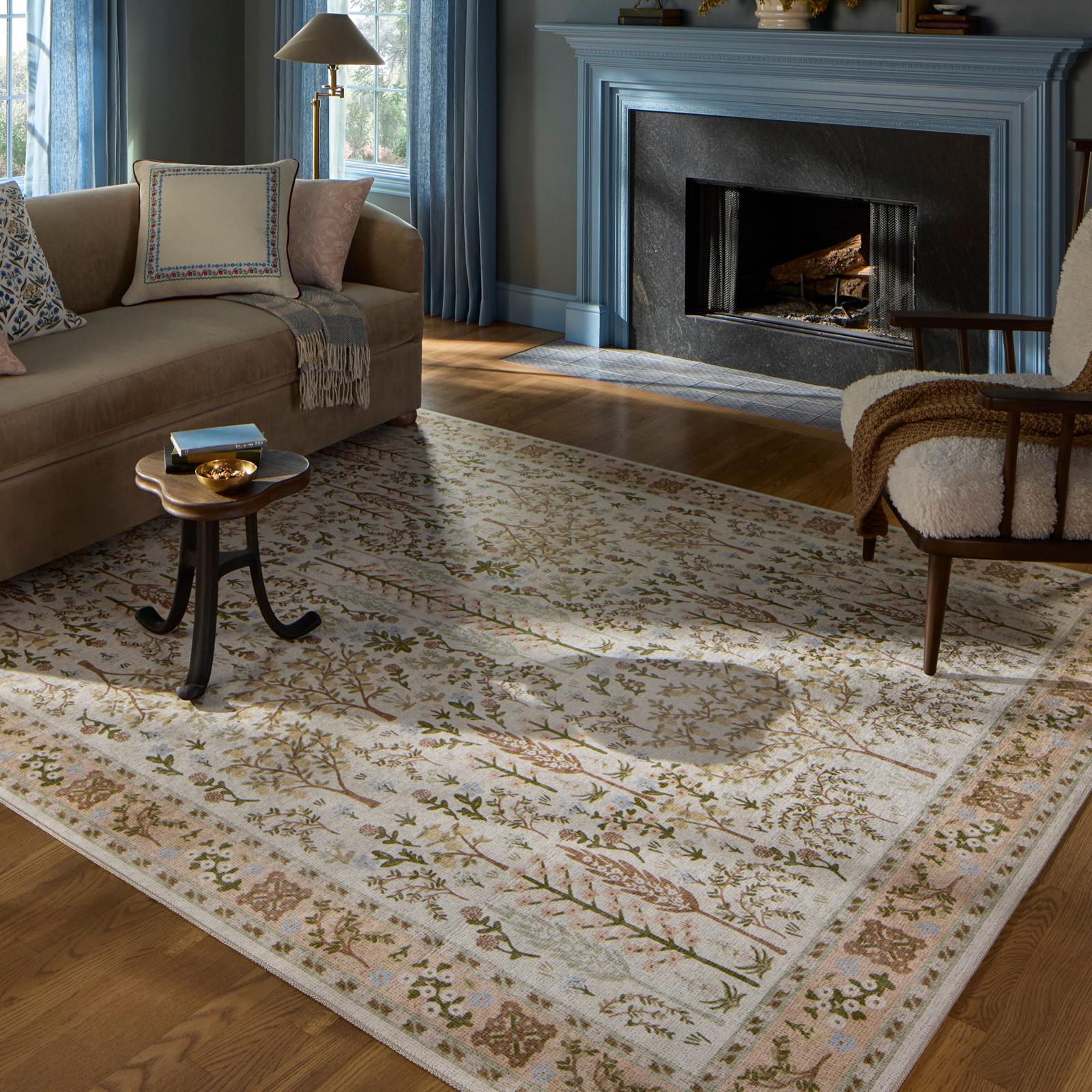 The Canopy Collection is a floral area rug with an enchanted forest design based on hand-painted artwork by Rifle Paper Co. in collaboration with Loloi. The whimsical design features lush scenes visited by charming woodland creatures, from prancing deer to beautifully plumed peacocks. This collection is power-loomed of a soft polyester in China, a durable construction for living room rugs, bedroom rugs, entryway rugs, and more.