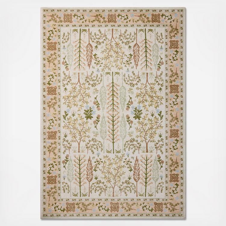 The Canopy Collection is a floral runner with an enchanted forest design based on hand-painted artwork by Rifle Paper Co. in collaboration with Loloi. The whimsical design features lush scenes visited by charming woodland creatures, from prancing deer to beautifully plumed peacocks. This collection is power-loomed of a soft polyester in China, a durable construction for living room rugs, bedroom rugs, entryway rugs, and more.
