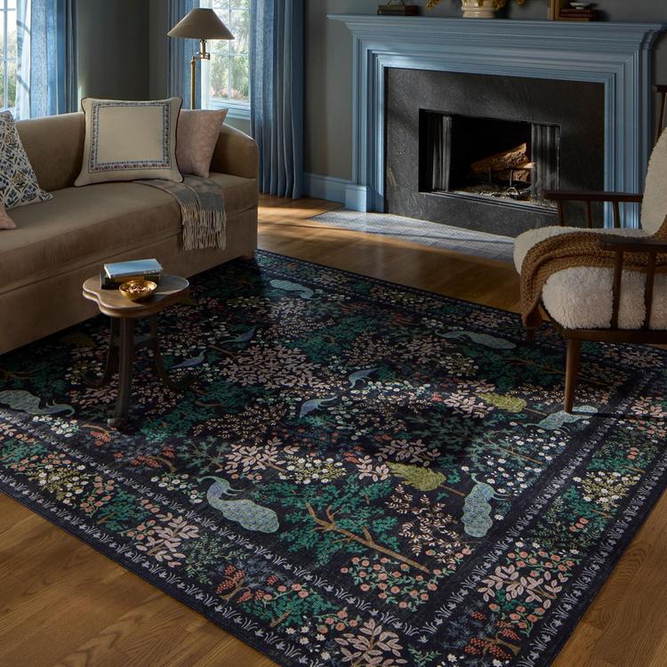 The Canopy Collection is a floral area rug with an enchanted forest design based on hand-painted artwork by Rifle Paper Co. in collaboration with Loloi. The whimsical design features lush scenes visited by charming woodland creatures, from prancing deer to beautifully plumed peacocks. This collection is power-loomed of a soft polyester in China, a durable construction for living room rugs, bedroom rugs, entryway rugs, and more.