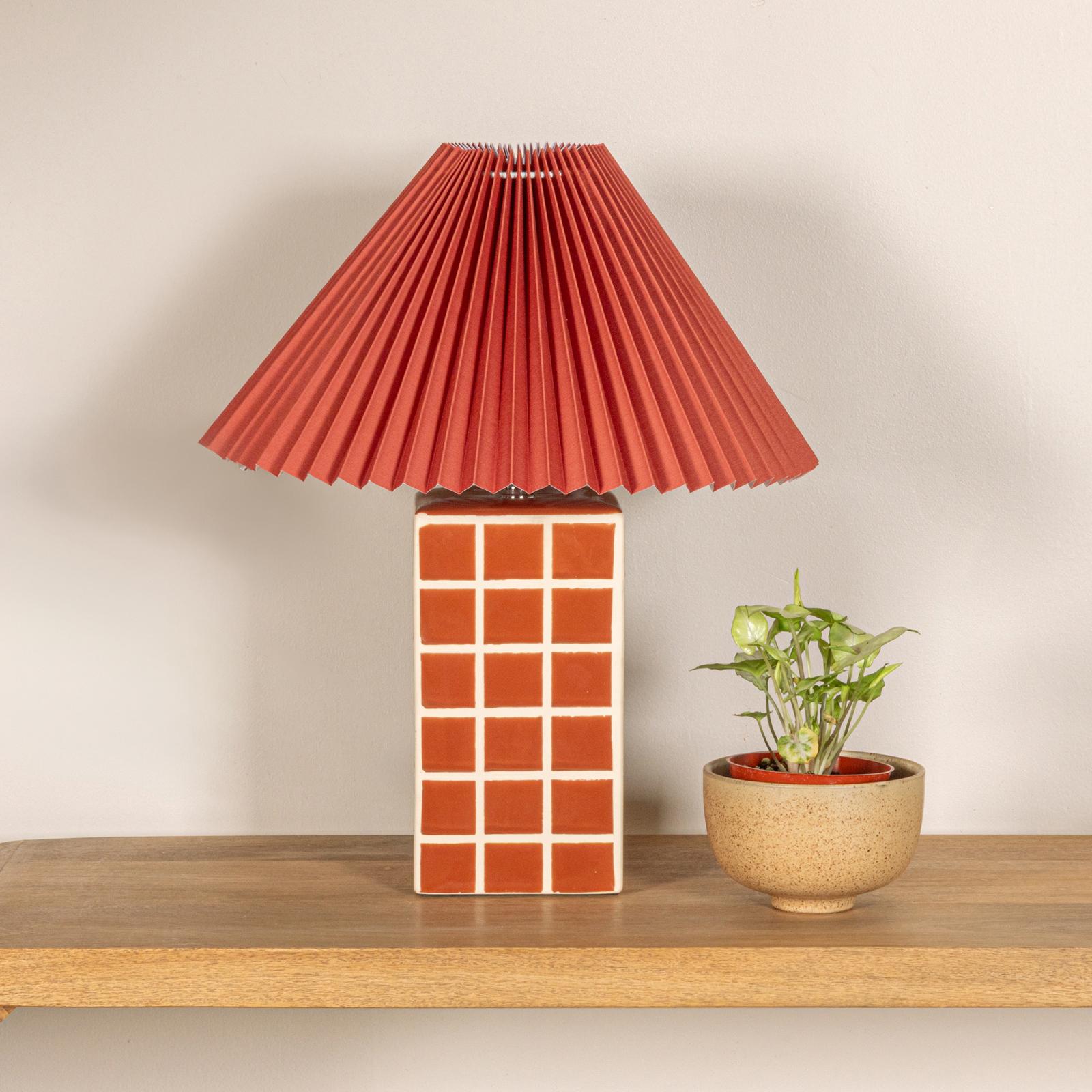 Bring a bold, modern charm to your space with the Red Ceramic Table Lamp. Its unique design features a rectangular ceramic base adorned with a striking grid pattern, exuding a contemporary aesthetic. Topped with a matching pleated red paper shade, this lamp provides a warm, ambient glow while serving as a statement piece. Ideal for desks, nightstands, or accent tables, this lamp effortlessly blends functionality with artistic flair.