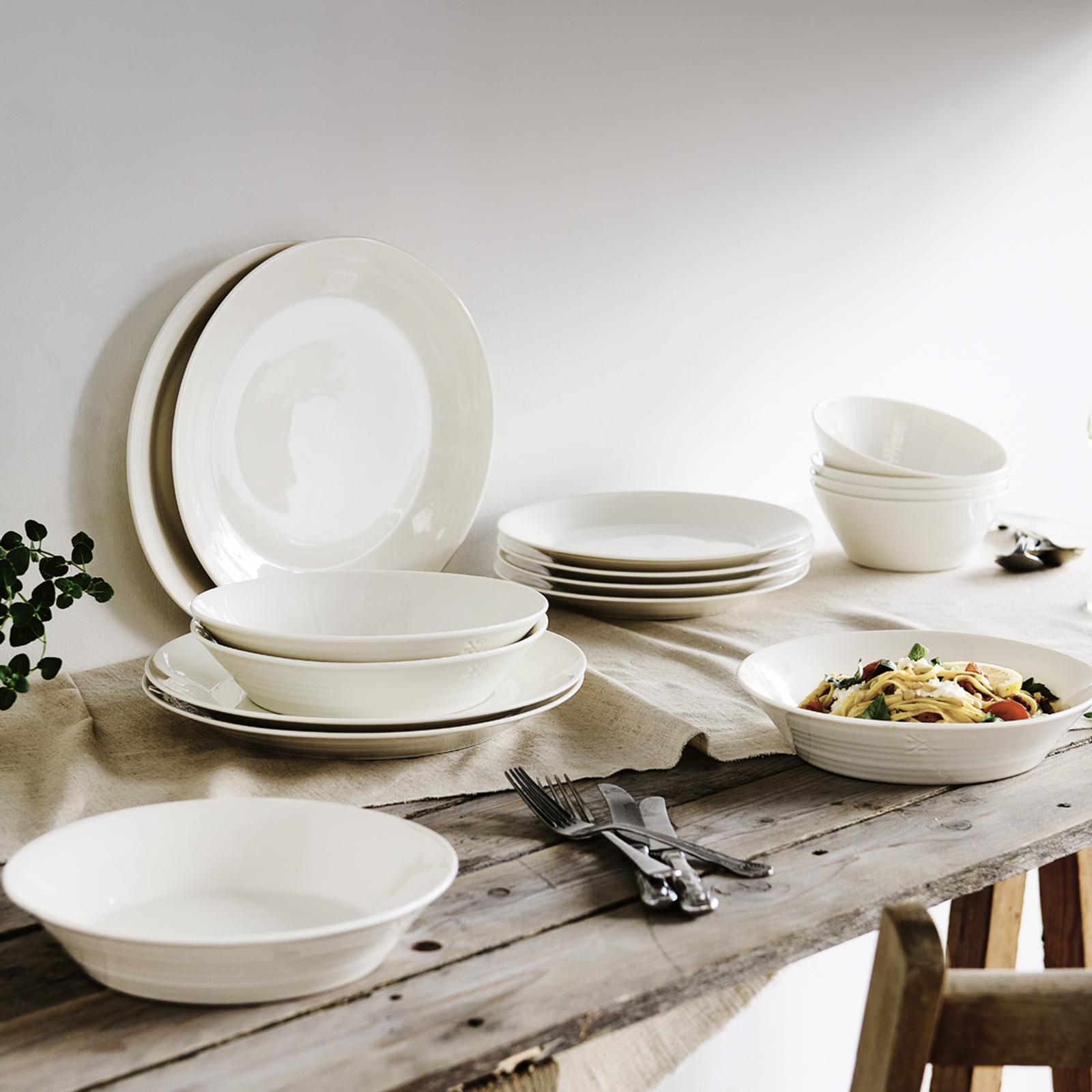A must-have starter set for singles, couples and families – introduce the 1815 Pure 12-Piece Set to the place you call home. Comprising four dinner plates, four side plates and four white cereal bowls, this white set is crafted from high-quality porcelain and a clear glaze that’ll make colourful food pop. With an artisanal feel thanks to the hand-applied stamps and toolmarks, it’s a relaxed, affordable everyday set that’s easy to mix and match with other tableware.