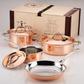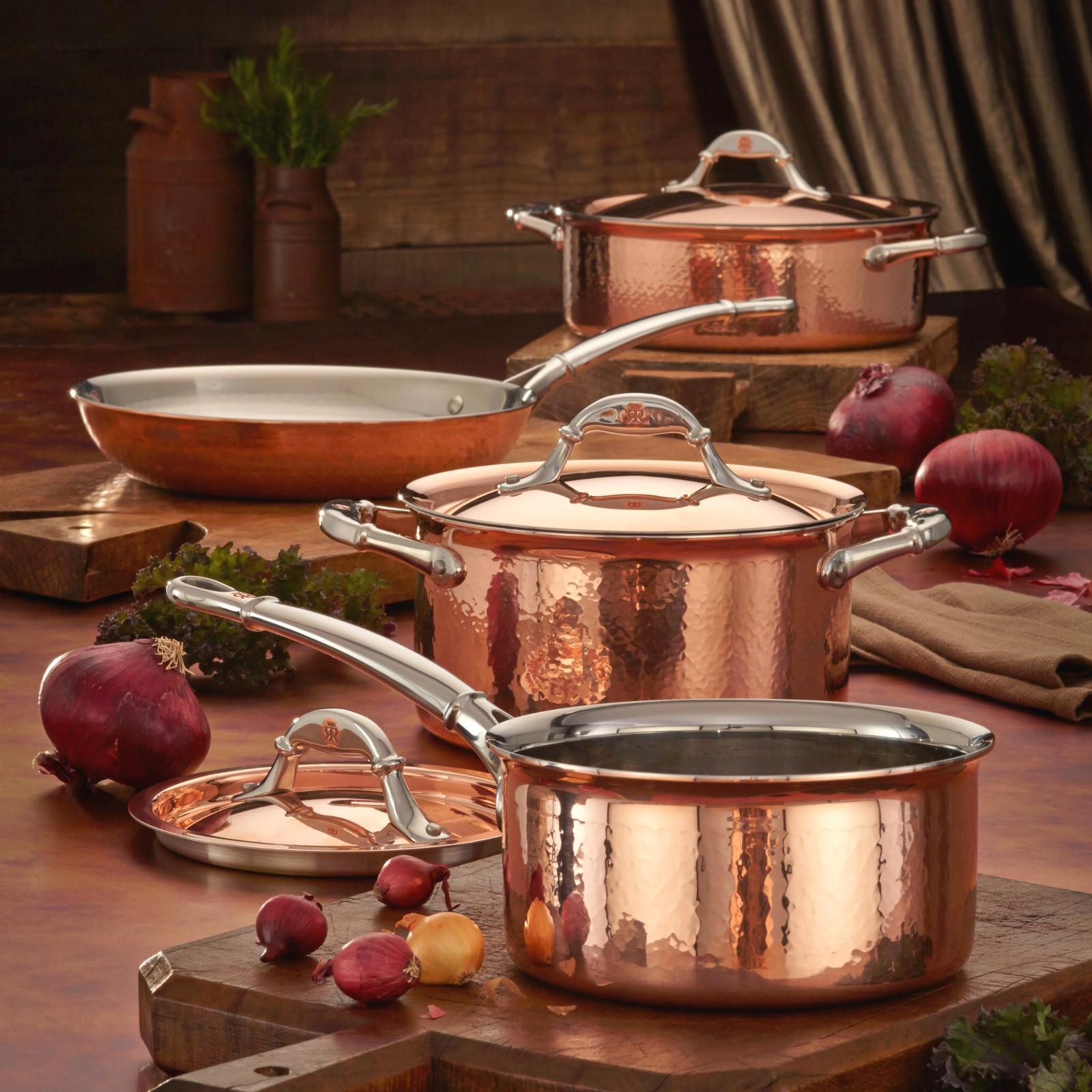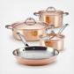 Gorgeous and artisanal, the hand-hammered Ruffoni Symphonia Cupra 7-Piece Cookware Set unites the enduring legacy of traditional Italian copper craftsmanship with culinary performance for the ultimate gourmet cookware. For generations to come, the jewel-like, hammered copper exteriors of Symphonia Cupra will enhance the aesthetic of any home and kitchen while providing epicurean excellence. Every heirloom-quality piece delivers impeccable performance by means of a copper-wrapped aluminum core for extraordinary heat conduction and a bonded stainless steel interior to assure durability and effortless cleanup. The set is perfectly poised to help prepare and deliver incomparable gastronomic experiences, from a fragrant soffritto tossed with vine-ripened tomatoes to an aromatic, cardamom-infused creme anglaise. Each pan and pot features beautifully shaped, mirror-finished cast stainless steel handles with stamped copper signets, while similarly adorned stainless steel lids accompany each covered piece. Oven safe to 450°F and suitable for all cooktops, except induction, this deluxe Ruffoni copper set provides the ideal basis for a home collection of Symphonia and Mini cookware to be treasured for a lifetime.